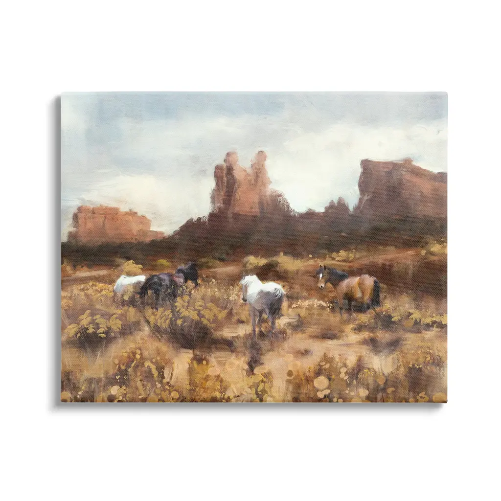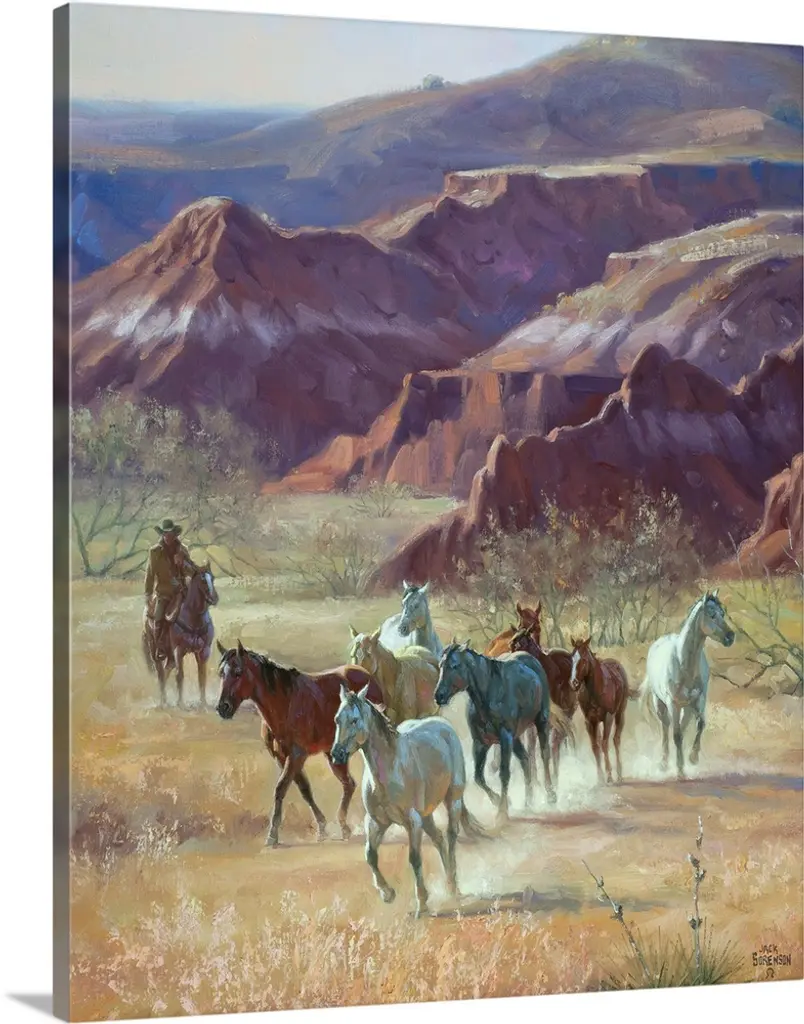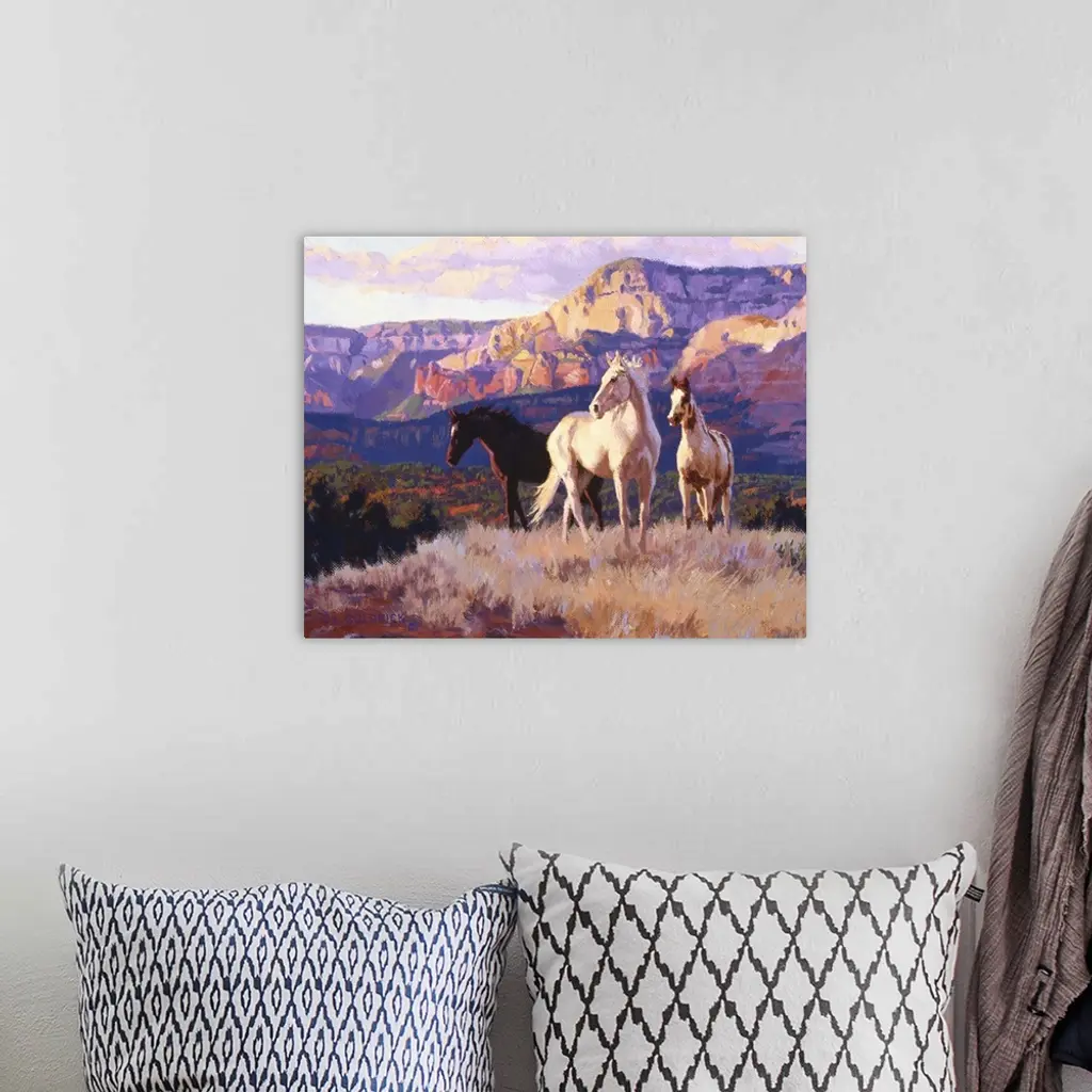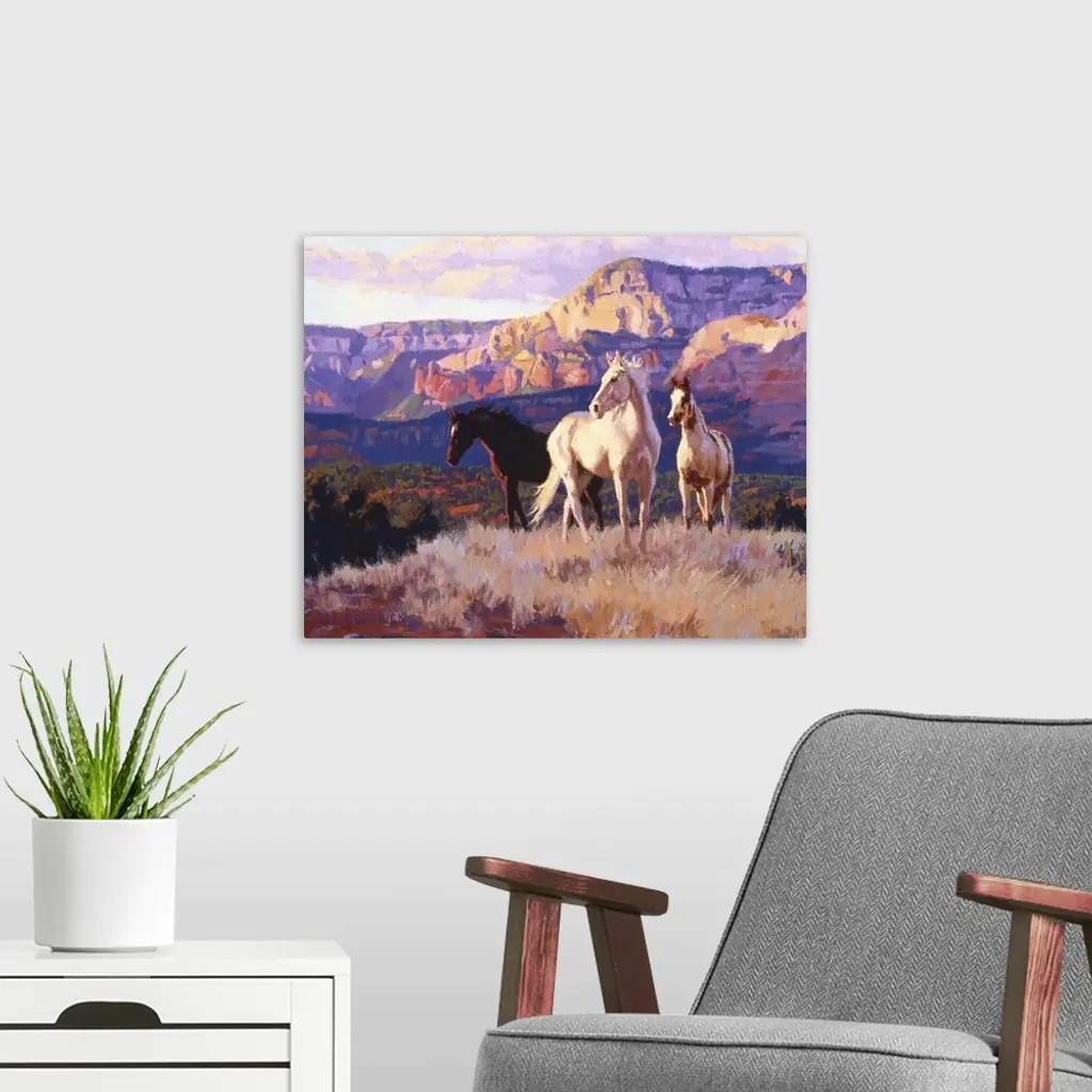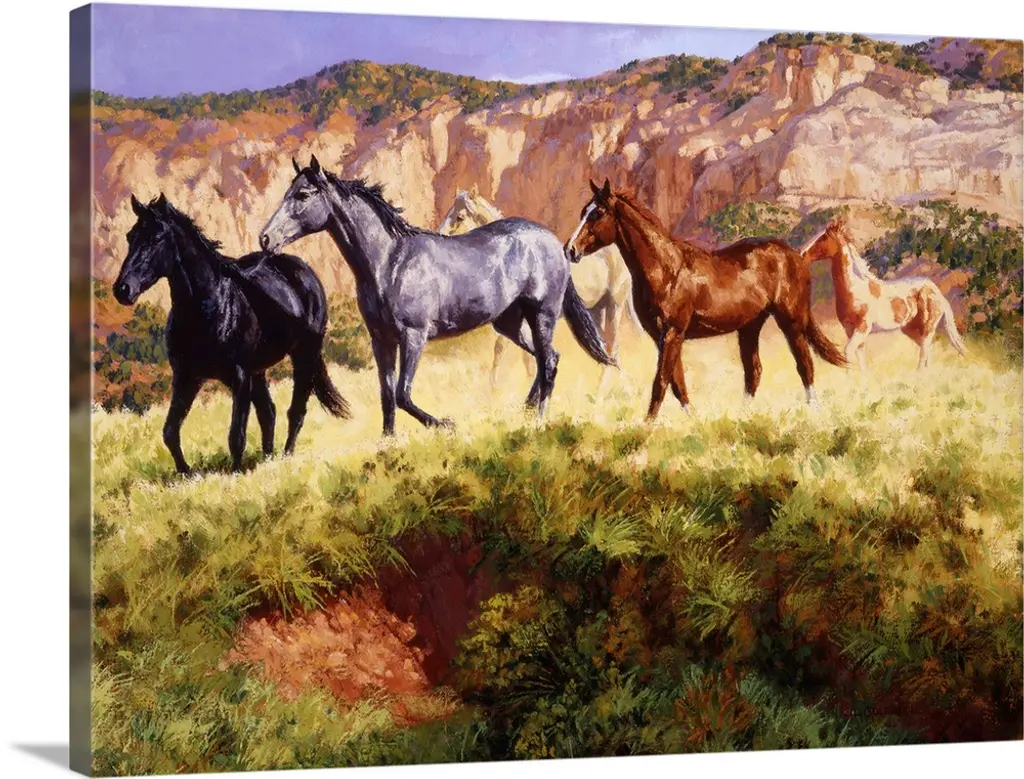 Contemporary colorful painting of a herd of horses running through a meadow, with a mountain range in the background.