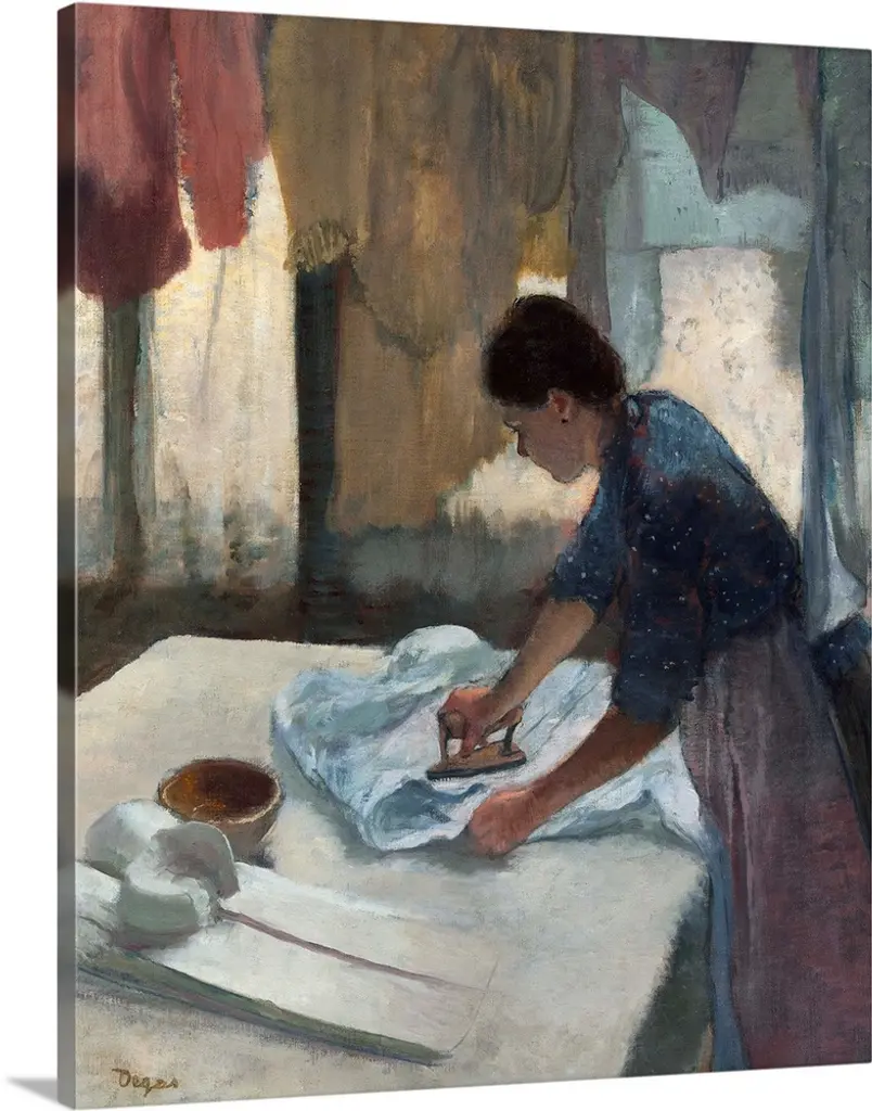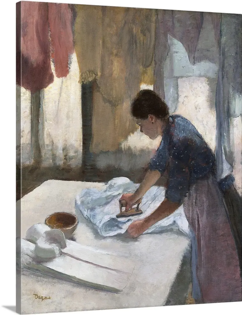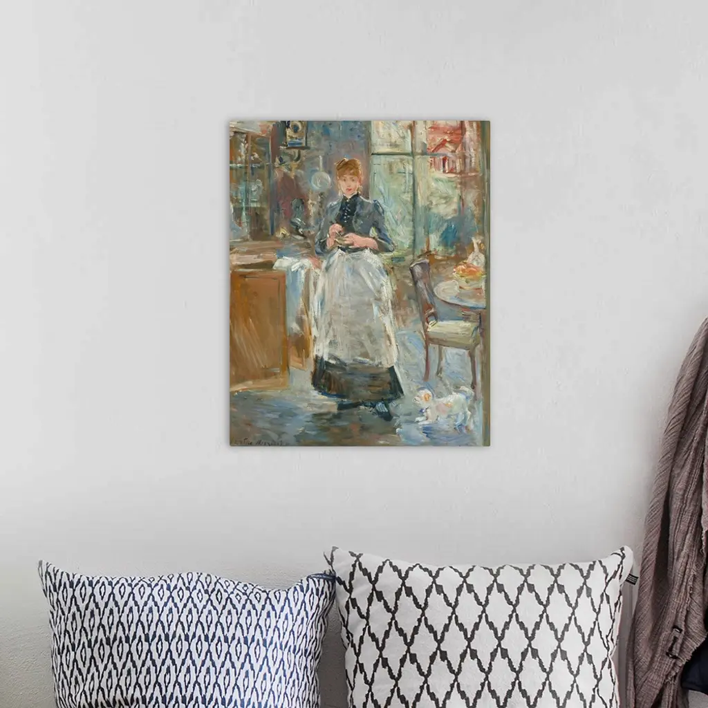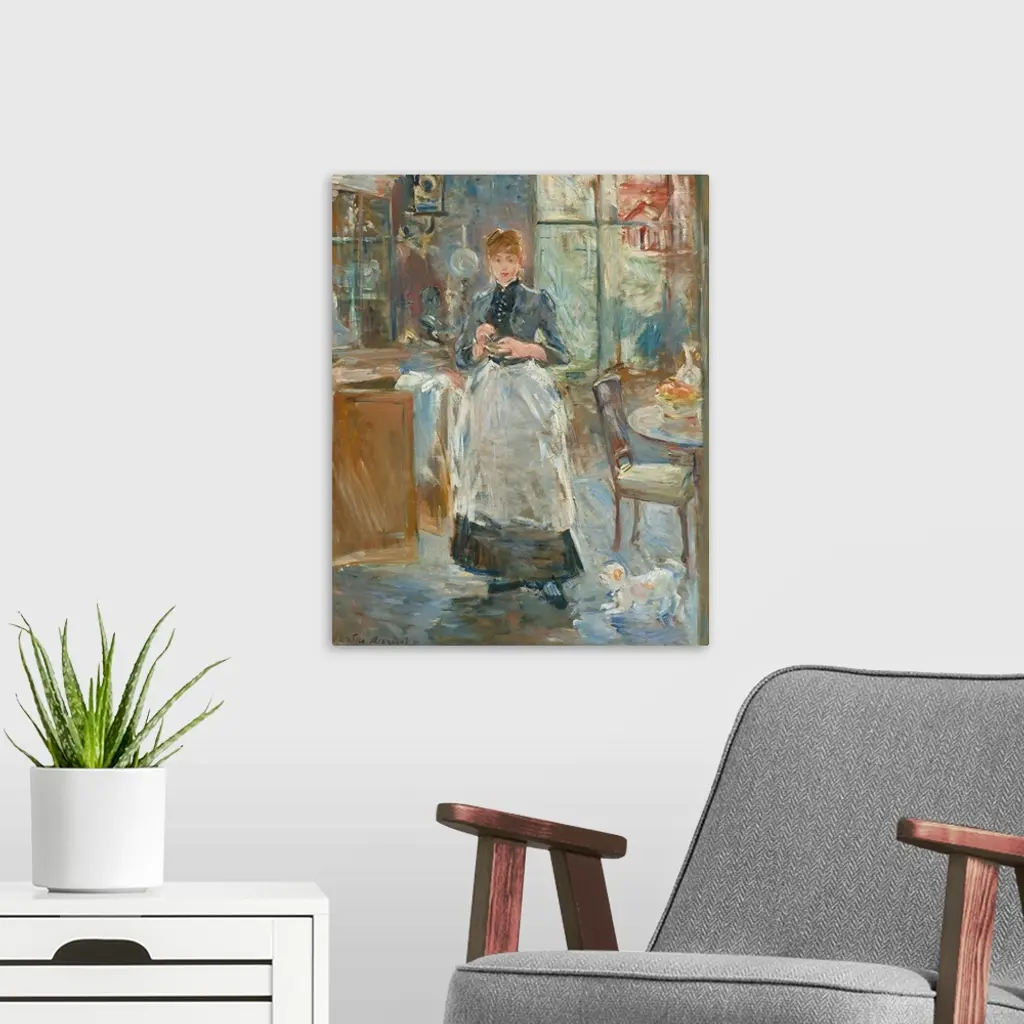 In the Dining Room, by Berthe Morisot, 1886, French impressionist painting, oil on canvas. Morisot's bold brushwork animates this portrait in a light filled interior
