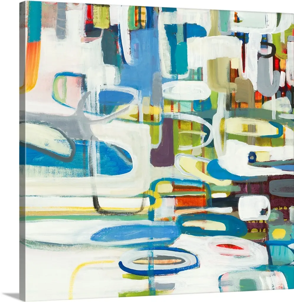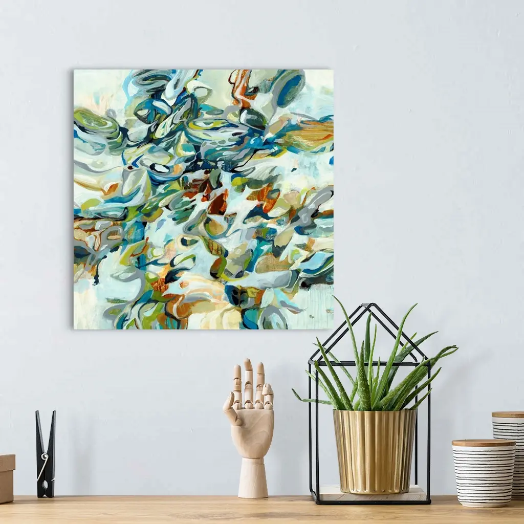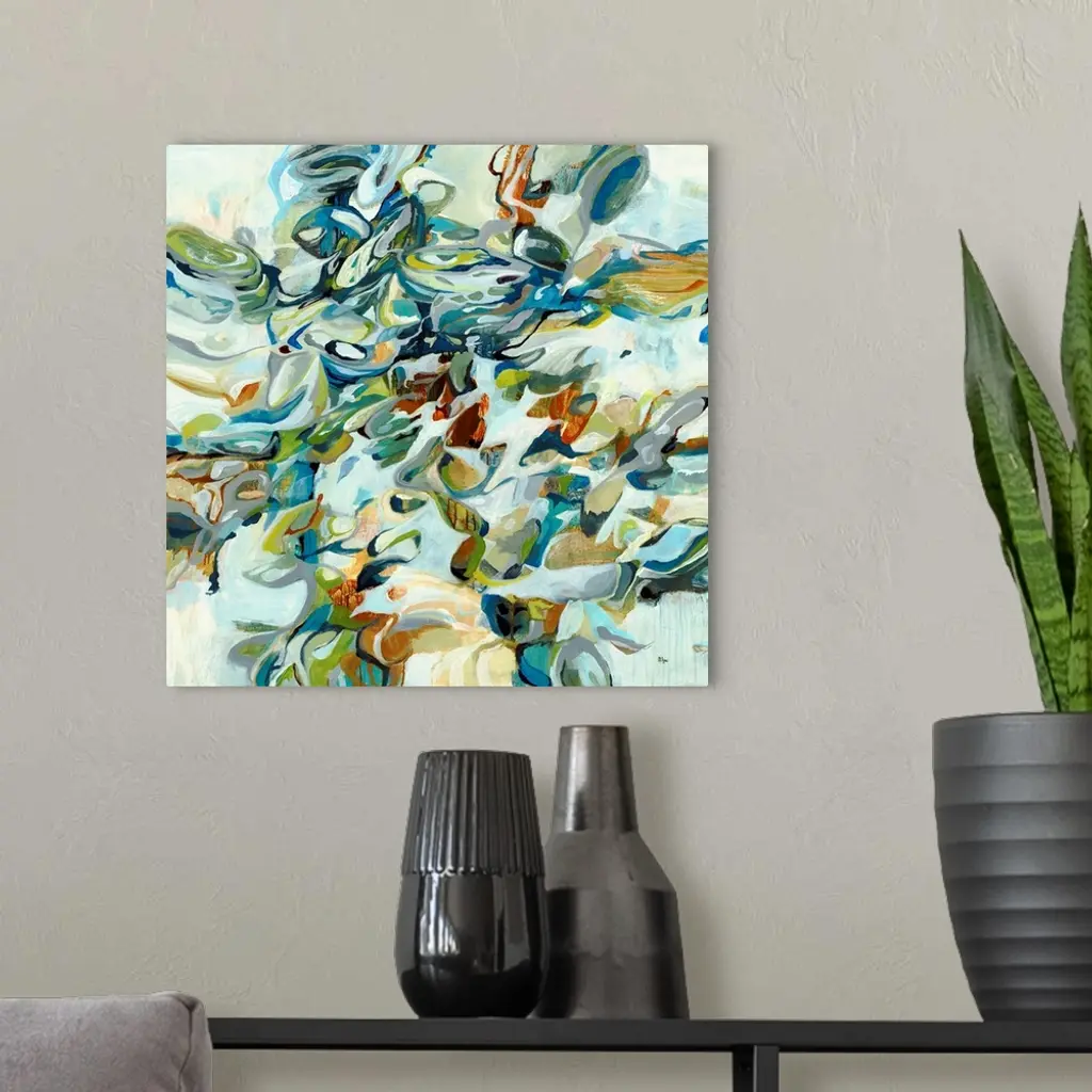 A contemporary painting in shades of leaf green and teal of organic shapes that resemble coral