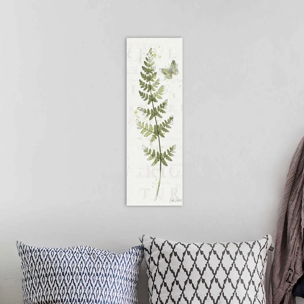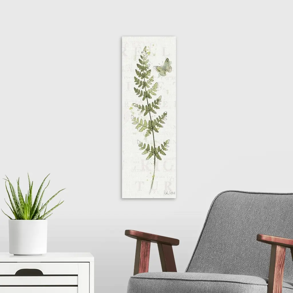 Tall rectangular watercolor painting of fern leaves with a butterfly on a textured white background with faint text.
