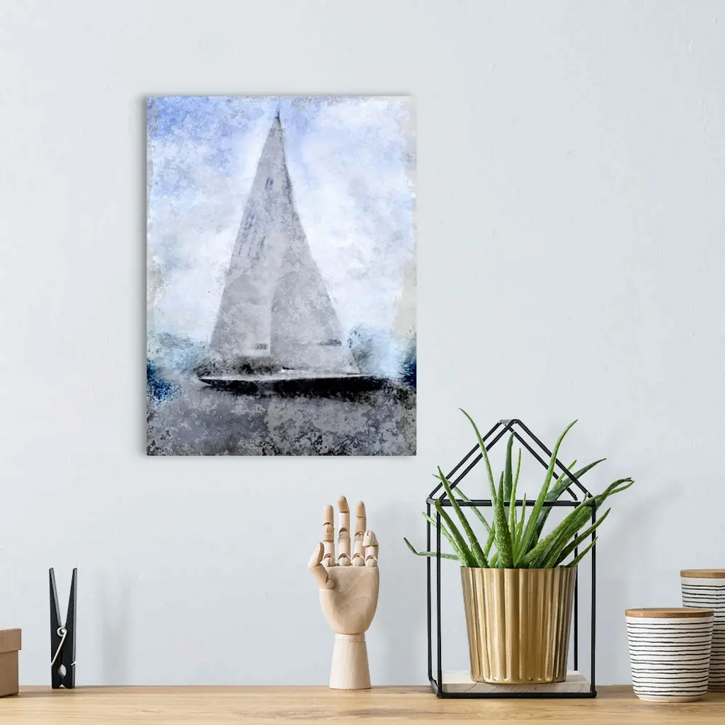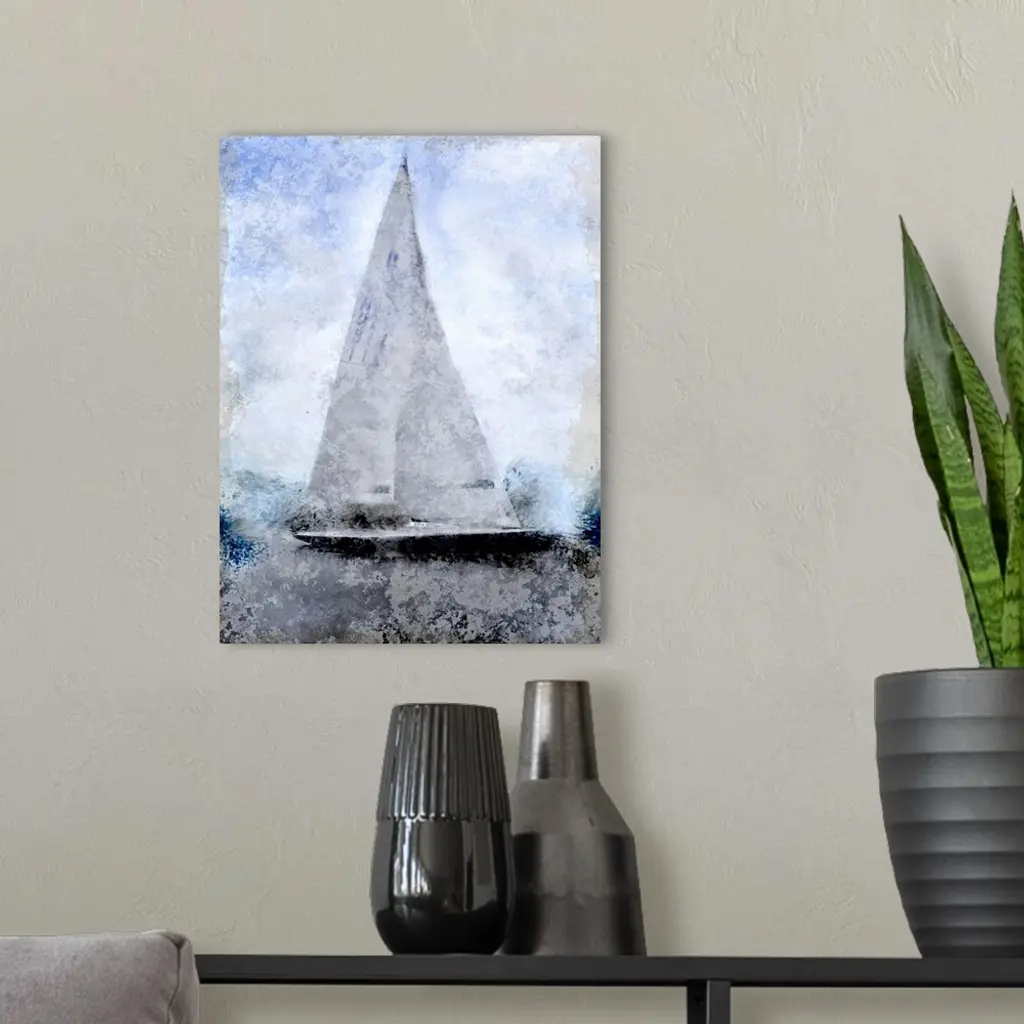 Contemporary artwork of a sailboat with a tall sharp sail sitting in a harbor with an overall smokey appearance.