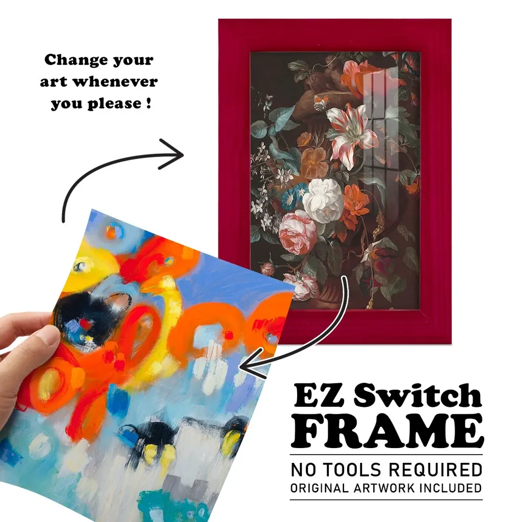 In the Loop V -EZ SWITCH Framed Print w/glass-Cherry Red A delightful, framed print. Featuring a solid wood frame with real wood glass. This premium print is giclee quality. In addition, every frame features a removable back and table top stand. This allows you to change your art in the future or to just stand the art on a table for a new look. We are sure you'll enjoy our new series of EZ SWITCH Framed Art. Solid Wood Frame Real Glass Removable / Replaceable Art Built in Tabletop Stand Sizes range from 4x6 up to 12x15 - buy just one or pair them up as sets as you see fit.