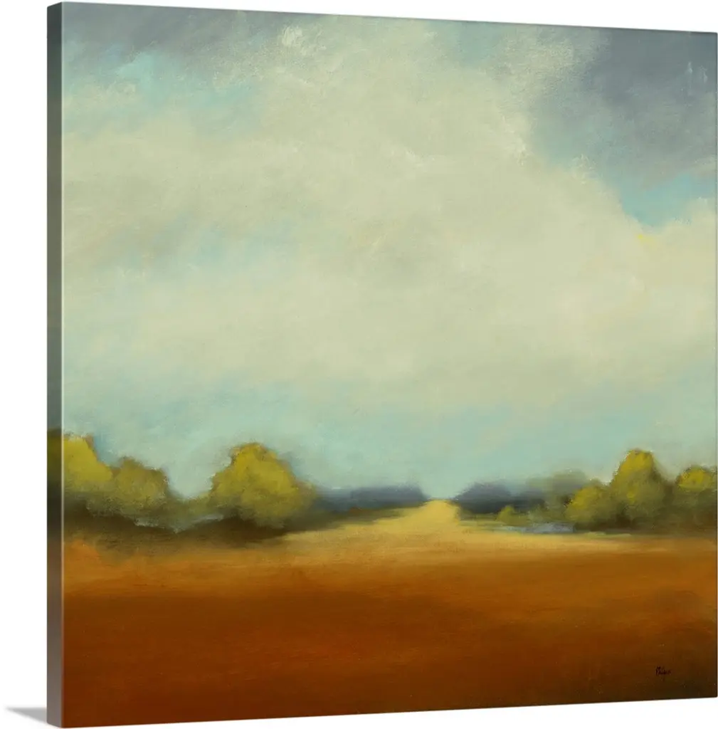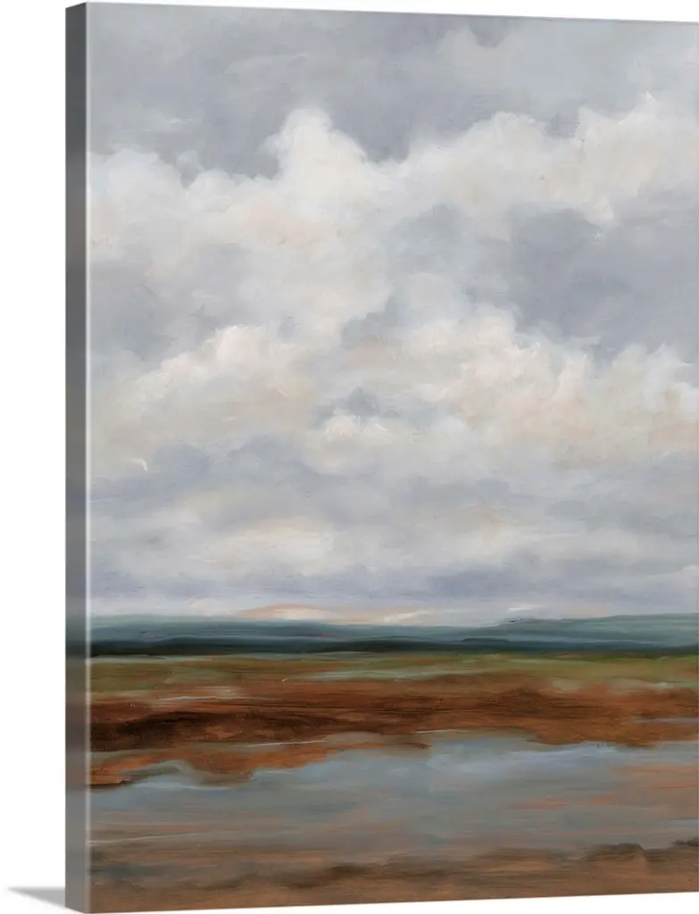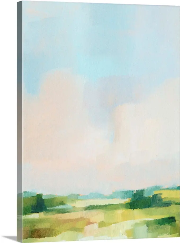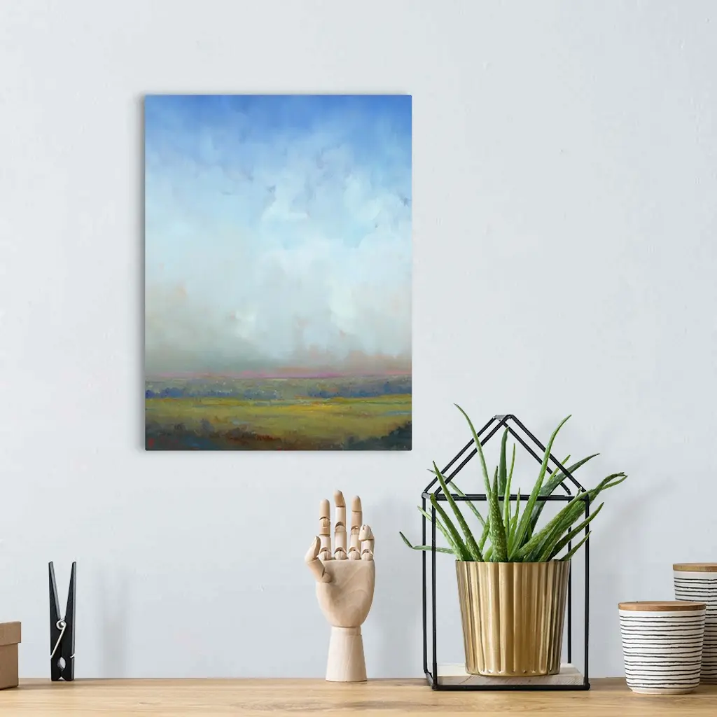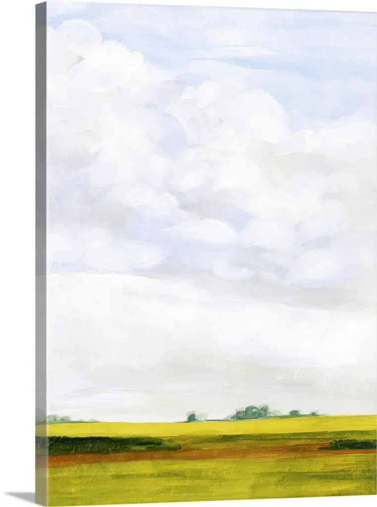 Contemporary landscape painting of a green field with towering clouds in the sky above.