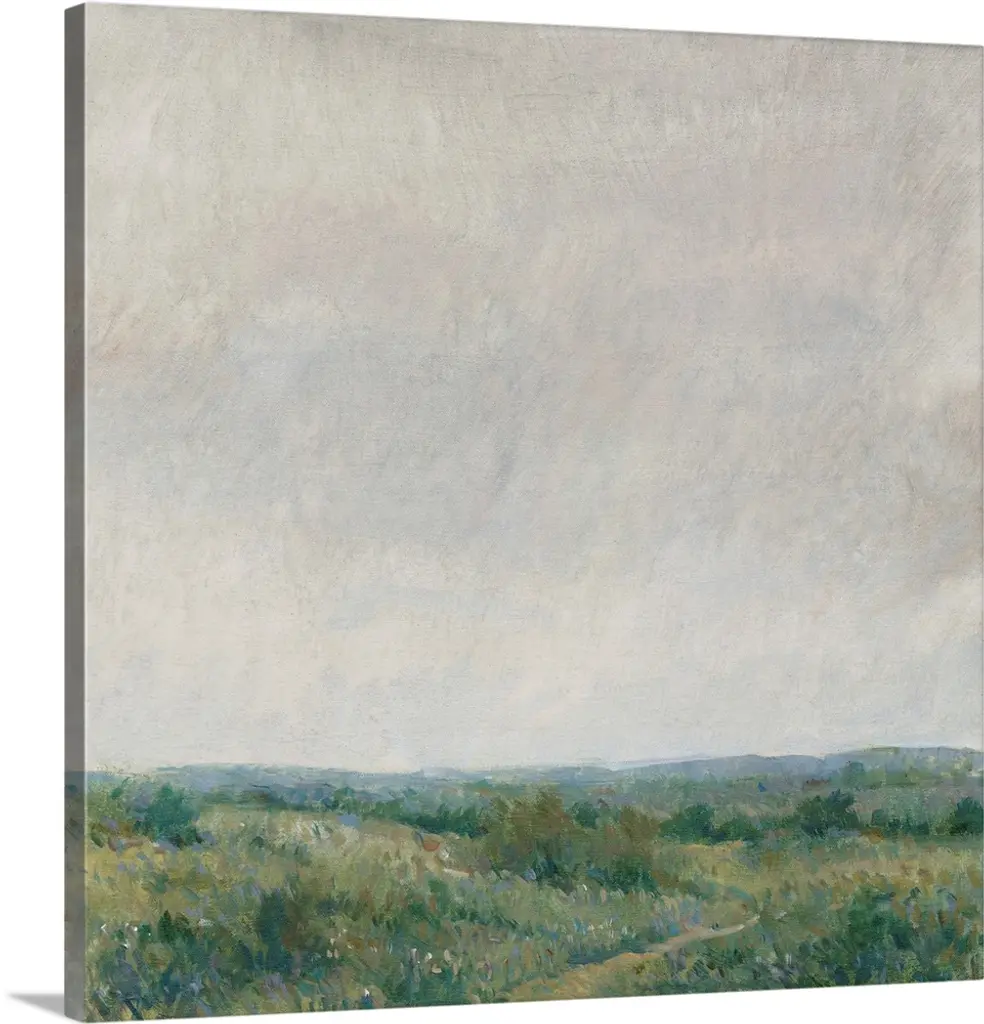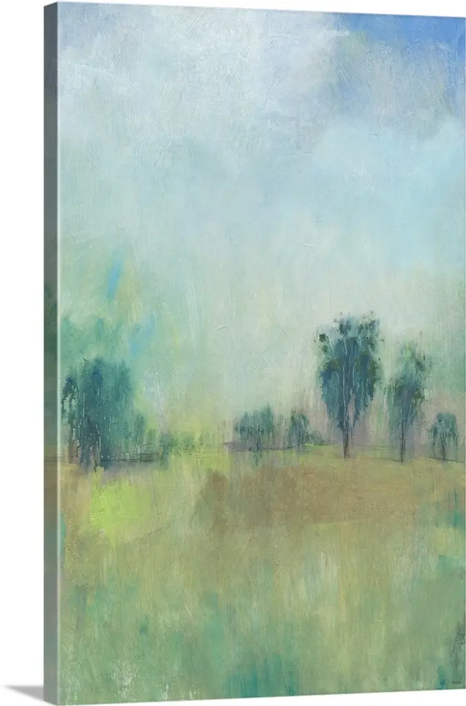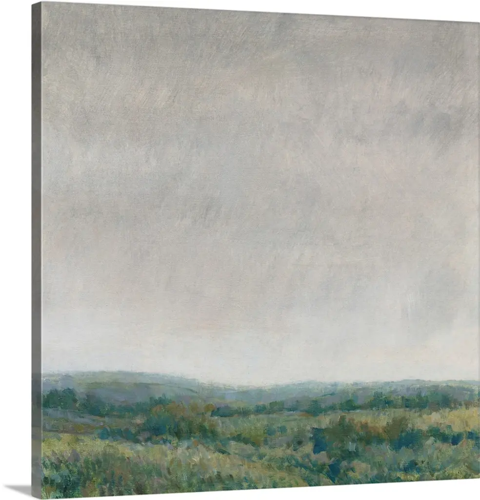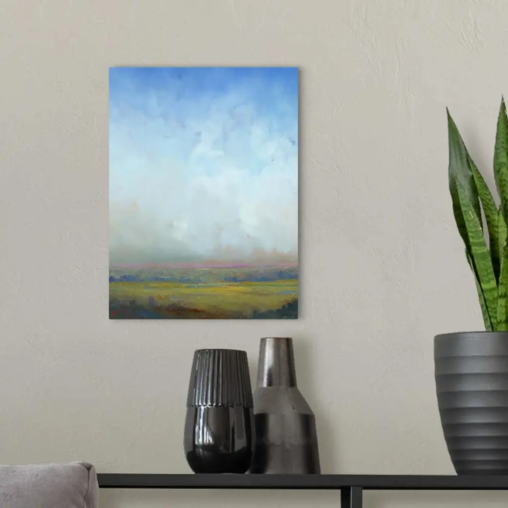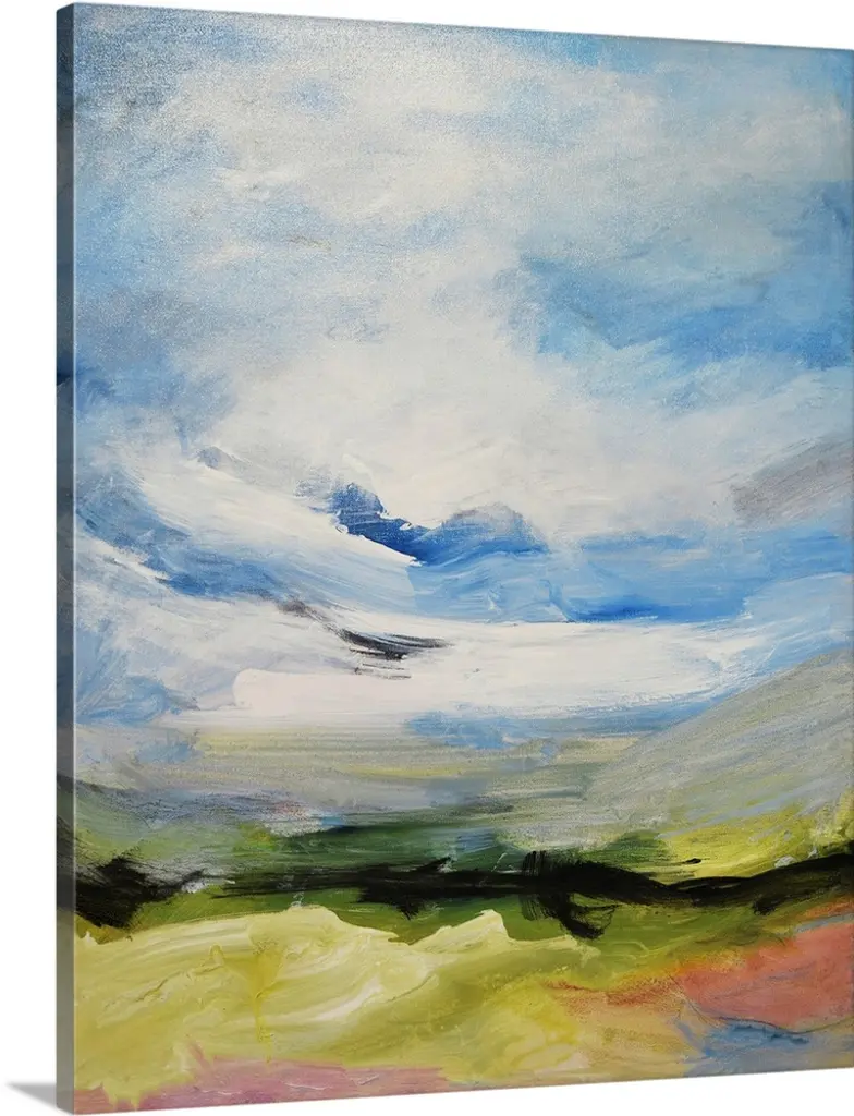 Contemporary landscape painting of a green field with towering clouds in the sky above.