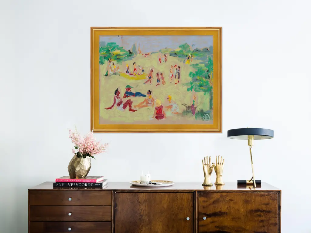DESCRIPTION: In the Park by Happy Menocal in Gold Frame, Small Art Print SPECIFICATIONS: Type: Framed Paper. Framed Size (in): 24x20. Orientation: Horizontal. Flush/Float/Matted: Flush. Frame Color: Gold. Hanging Hardware: Picture Perfect. FRAMING: Each art work arrives framed and ready to hang. We use handmade frames with a plexiglass glazing front, because it offers less glare than standard glass. At this time, we only offer framed prints. ARTIST BIO: Happy Menocal is a New York-based artist and creative director. She is known for her spirited illustration style and profligate use of color. Founded in 2012, her studio specializes in personal and corporate event stationery, brand identity, murals and textile design for private clients and hospitality groups.