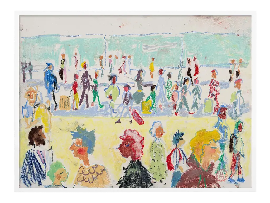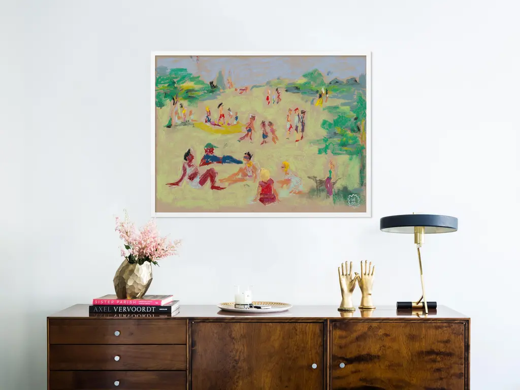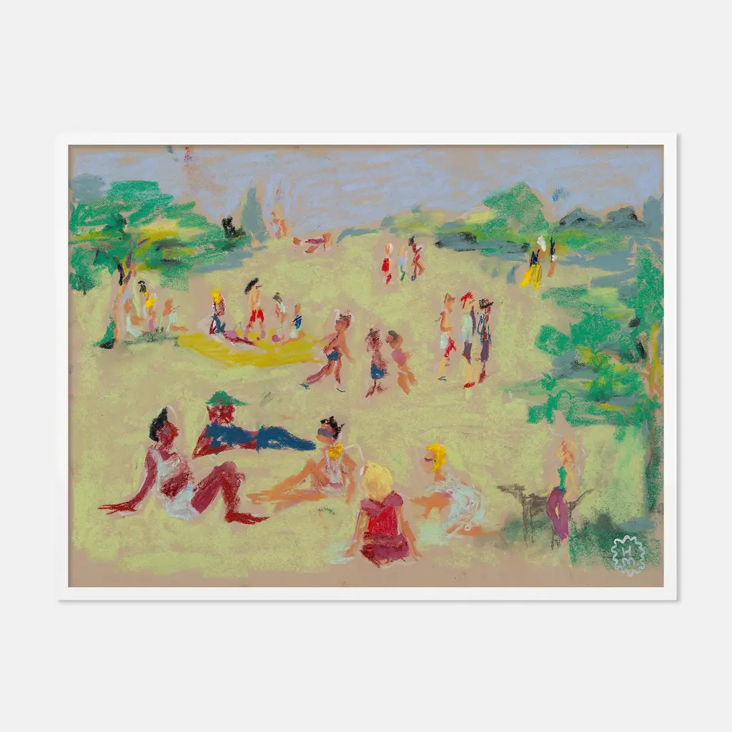 DESCRIPTION: In the Park by Happy Menocal in White Frame, XS Art Print SPECIFICATIONS: Type: Framed Paper. Framed Size (in): 16x12. Orientation: Horizontal. Flush/Float/Matted: Flush. Frame Color: White. Hanging Hardware: Picture Perfect. FRAMING: Each art work arrives framed and ready to hang. We use handmade frames with a plexiglass glazing front, because it offers less glare than standard glass. At this time, we only offer framed prints. ARTIST BIO: Happy Menocal is a New York-based artist and creative director. She is known for her spirited illustration style and profligate use of color. Founded in 2012, her studio specializes in personal and corporate event stationery, brand identity, murals and textile design for private clients and hospitality groups.