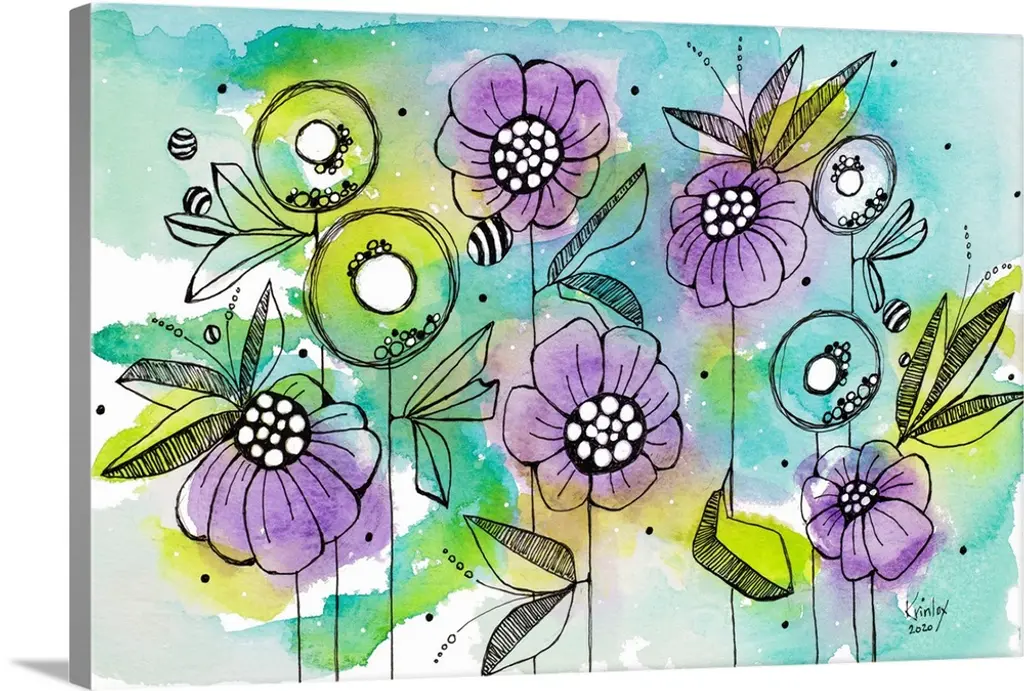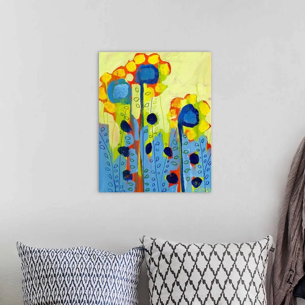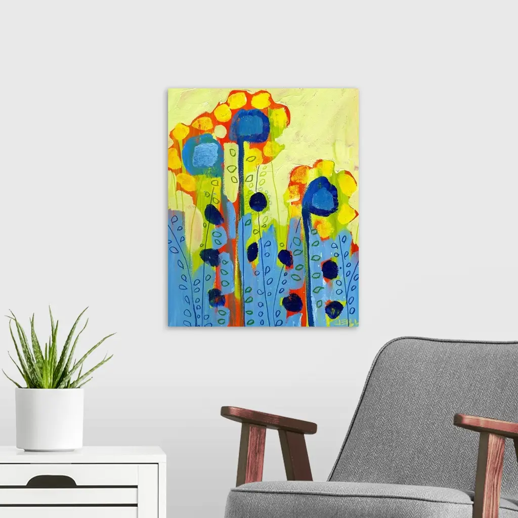 Portrait, abstract painting of several tall flowers with circular shapes used for petals and leaves. Painted with thick brushstrokes and harsh transitions of color.