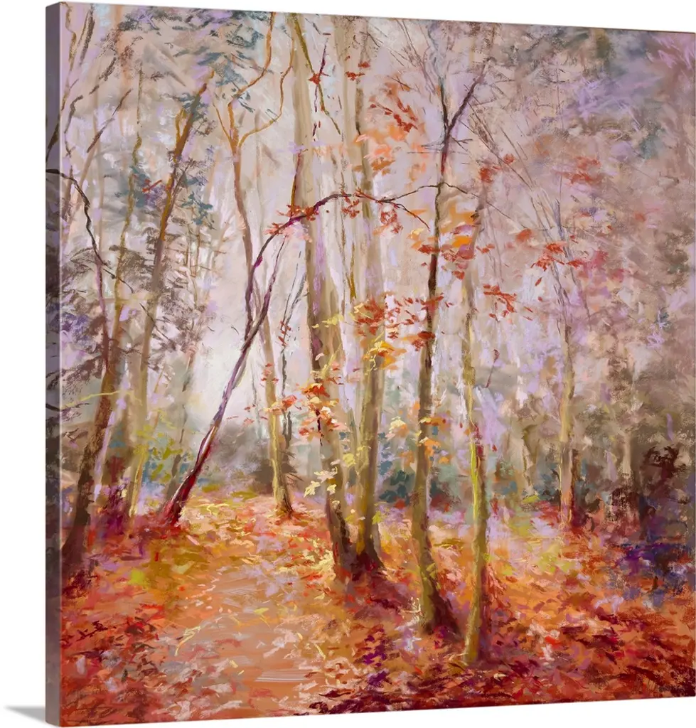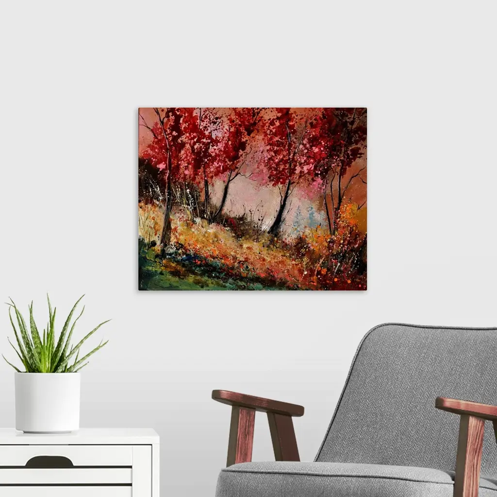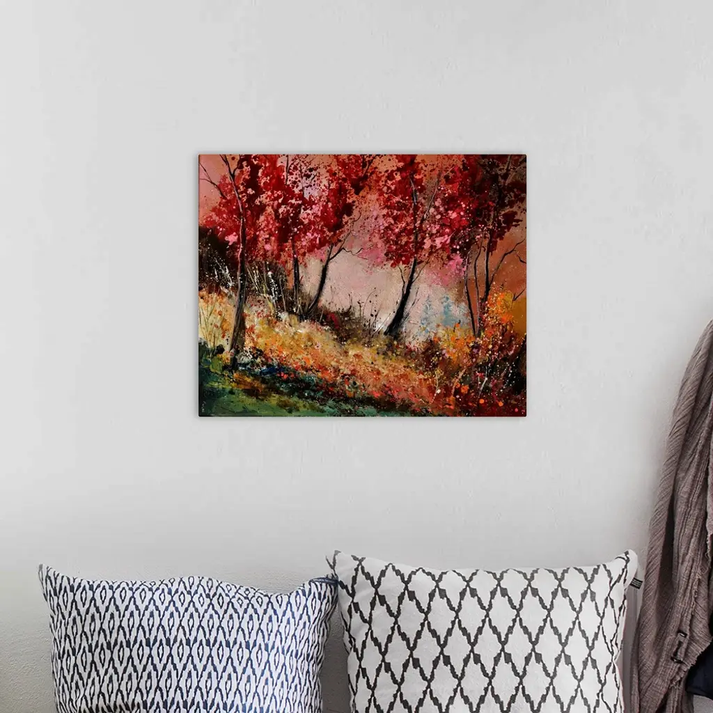 Landscape painting of a group of red leaved trees in the fall with speckles of paint overlapping.