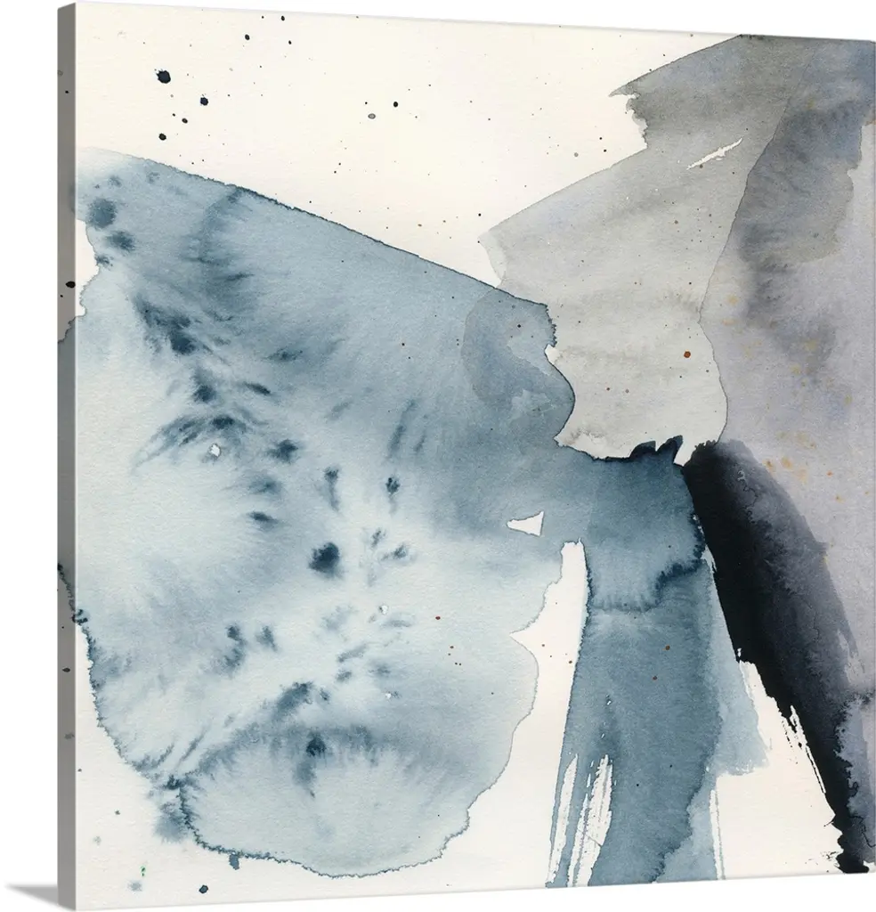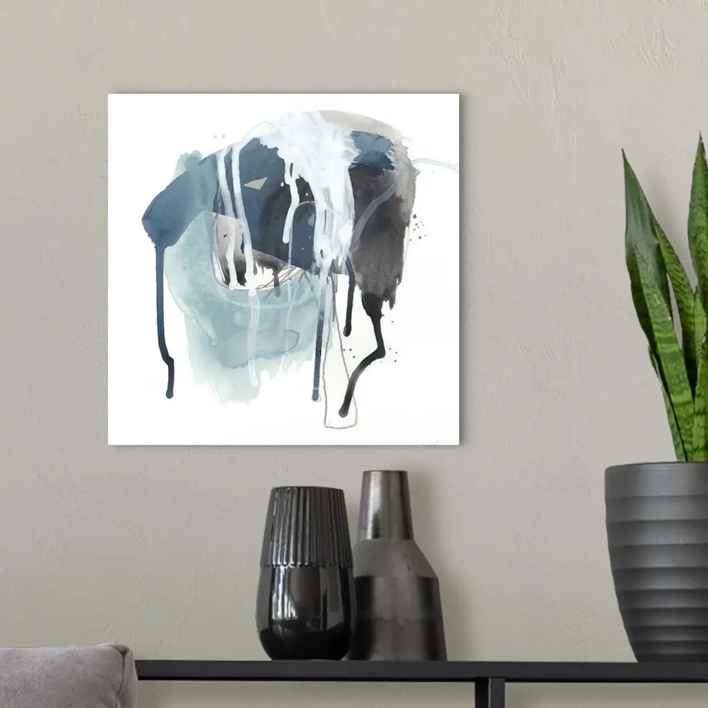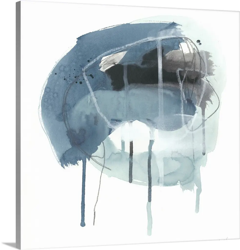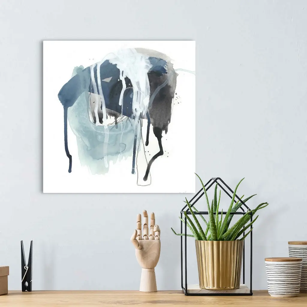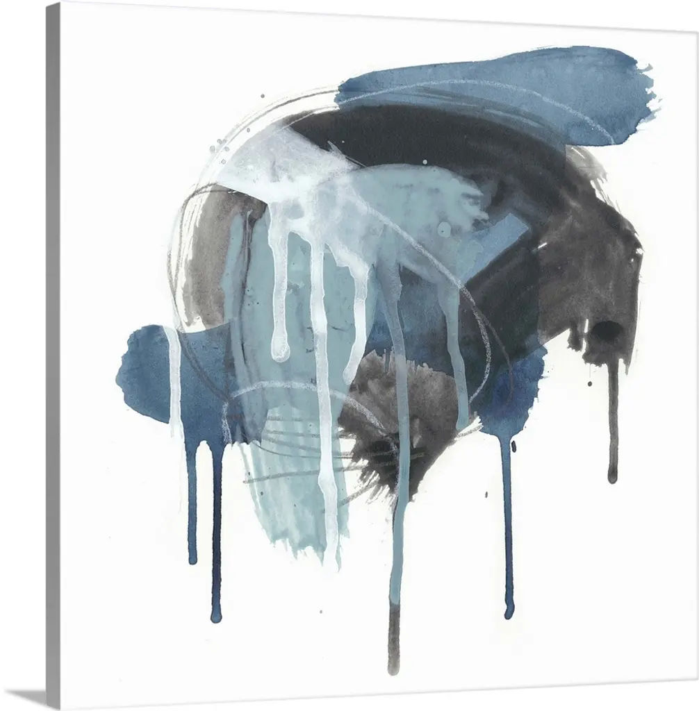 Square abstract painting in black, blue and white with drips of the overlapping paint on a white background.