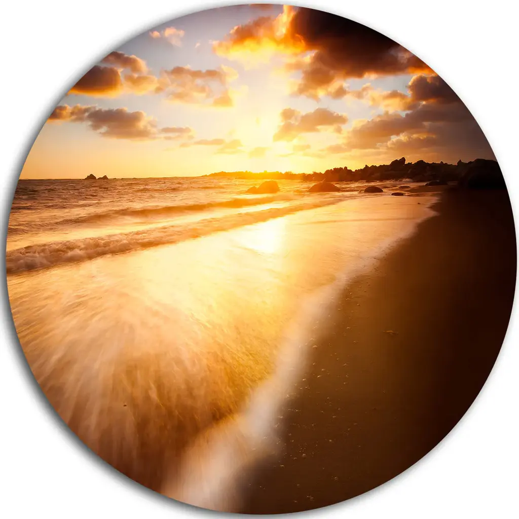 Bring Contemporary Abstraction to your home with this large Circle Metal wall art. This Incredible Seashore under Cloudy Sky Metal Artwork makes it the focal point of any room or office. - White Gloss Coating ensures colors are extra vibrant with light reflection.- Aluminum grade Sheet Metal with 1 inch mounting frame on the back giving the illusion that the artwork is floating on the wall..- Mounting Brackets are included along with instructions.- High Quality Digital images are created directly into a glossy aluminum panel producing a stunning and captivating print into the glossy finish of the metal.- Water, Fire and Scratch resistant HD Aluminum panels.- Looks better than any photo paper and guaranteed to last at least 20 years- Easy to clean with a microfiber cloth. Colors are far superior to regular Canvas Art. - Easy to Hang