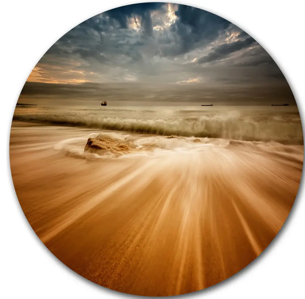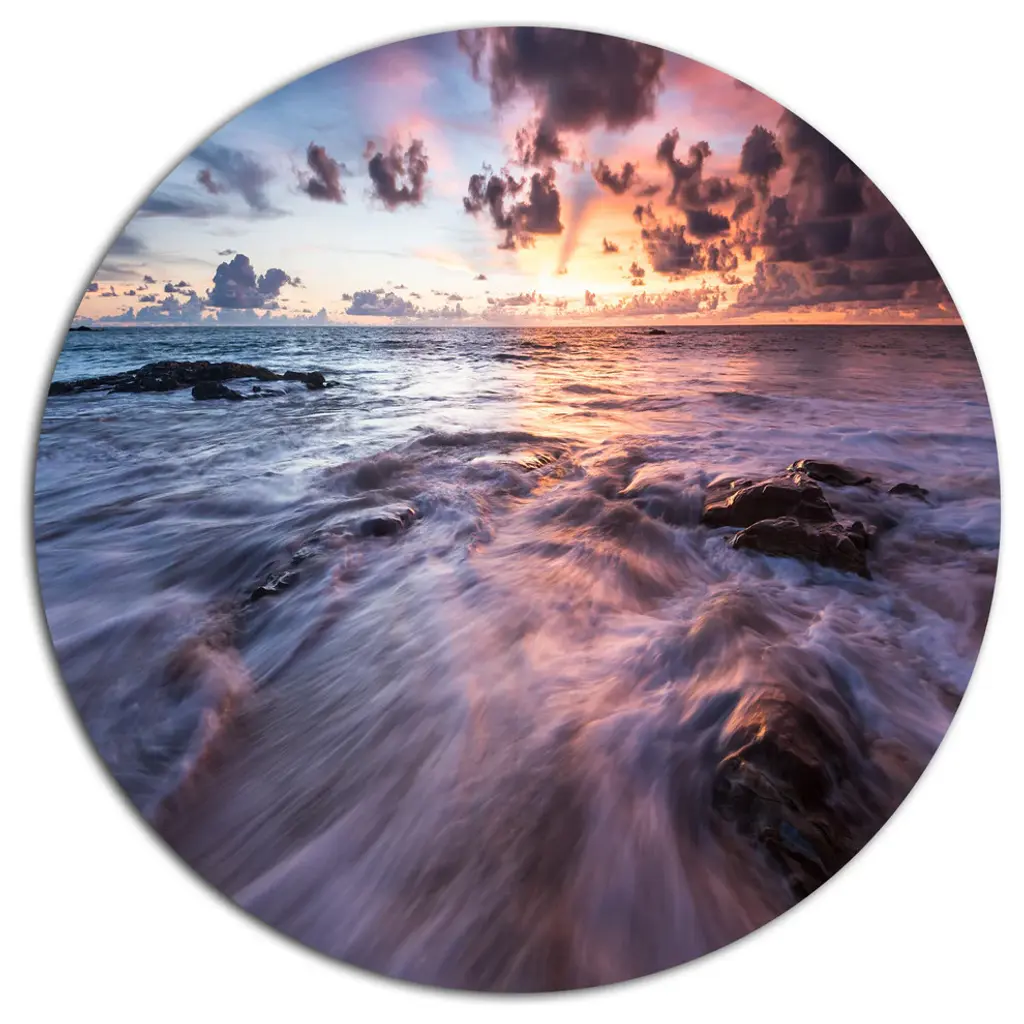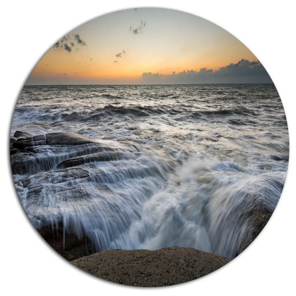 Incredible Sunset With White Waves, Seashore Round Metal Wall Art, 11"