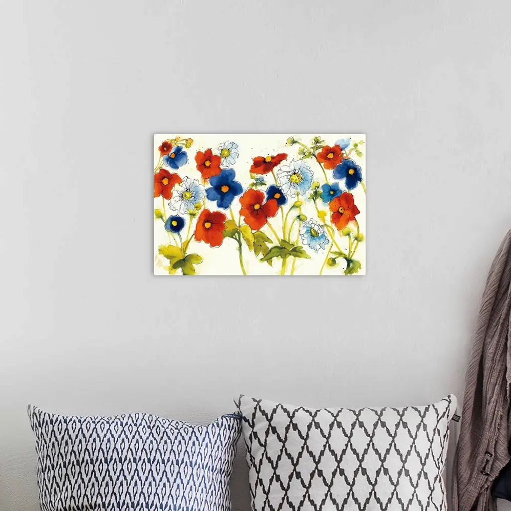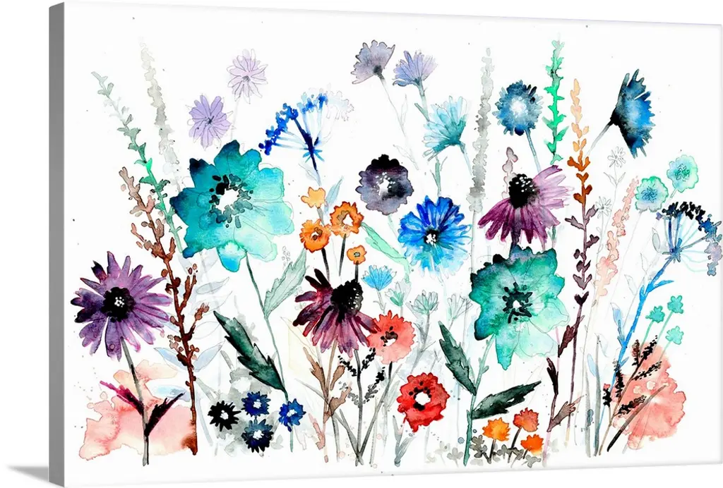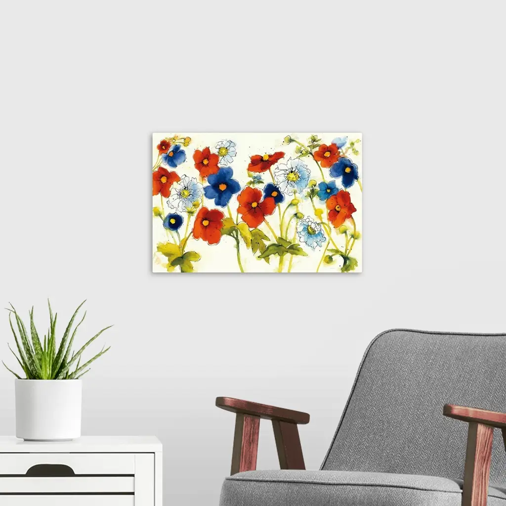 Large watercolor painting with red-orange, blue, and white flowers on a white background with a little bit of black paint splatter.