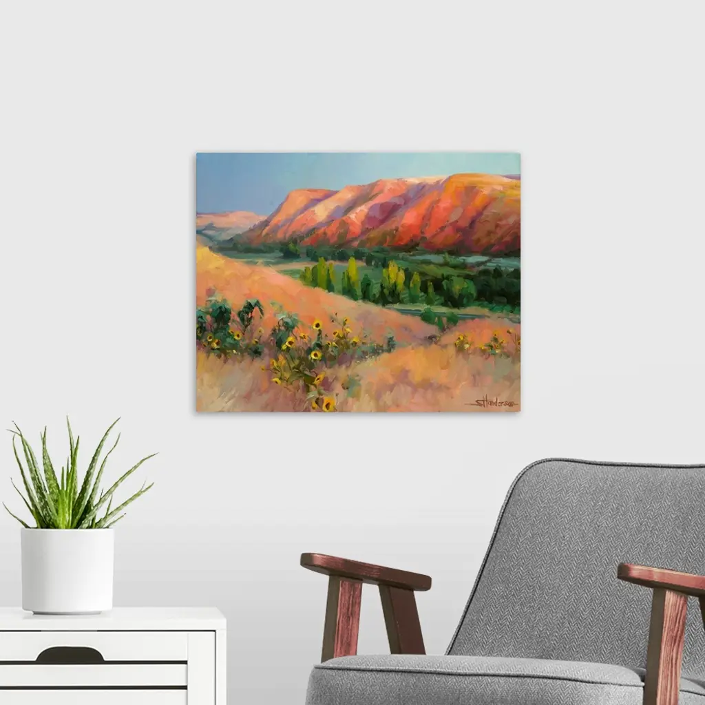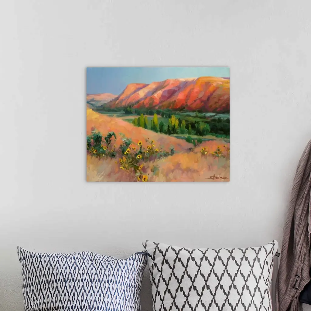 Traditional impressionist landscape painting of wild sunflowers overlooking the twilight lit hills of a country landscape.