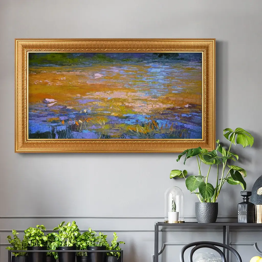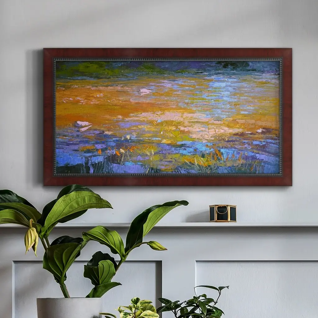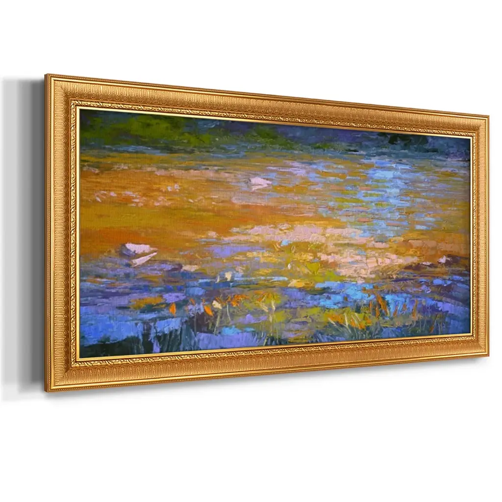 Indian Summer Premium Framed Canvas- Ready to Hang A Premium Framed Canvas created to last. Framed in distressed wood and available in an array of sizes and colors Featuring a beveled a solid wood stretcher bar, each piece comes ready to hand 3 SIZES AVAILABLE 21''X37'' - Overall Size 25''X45'' - Overall Size 29''x53'' - Overall Size Each piece is made to order. Each piece comes with hanging hardware. Made in the USA Ready to Hang Giclee Paper Print Acrylic Glass Beveled Matt Board