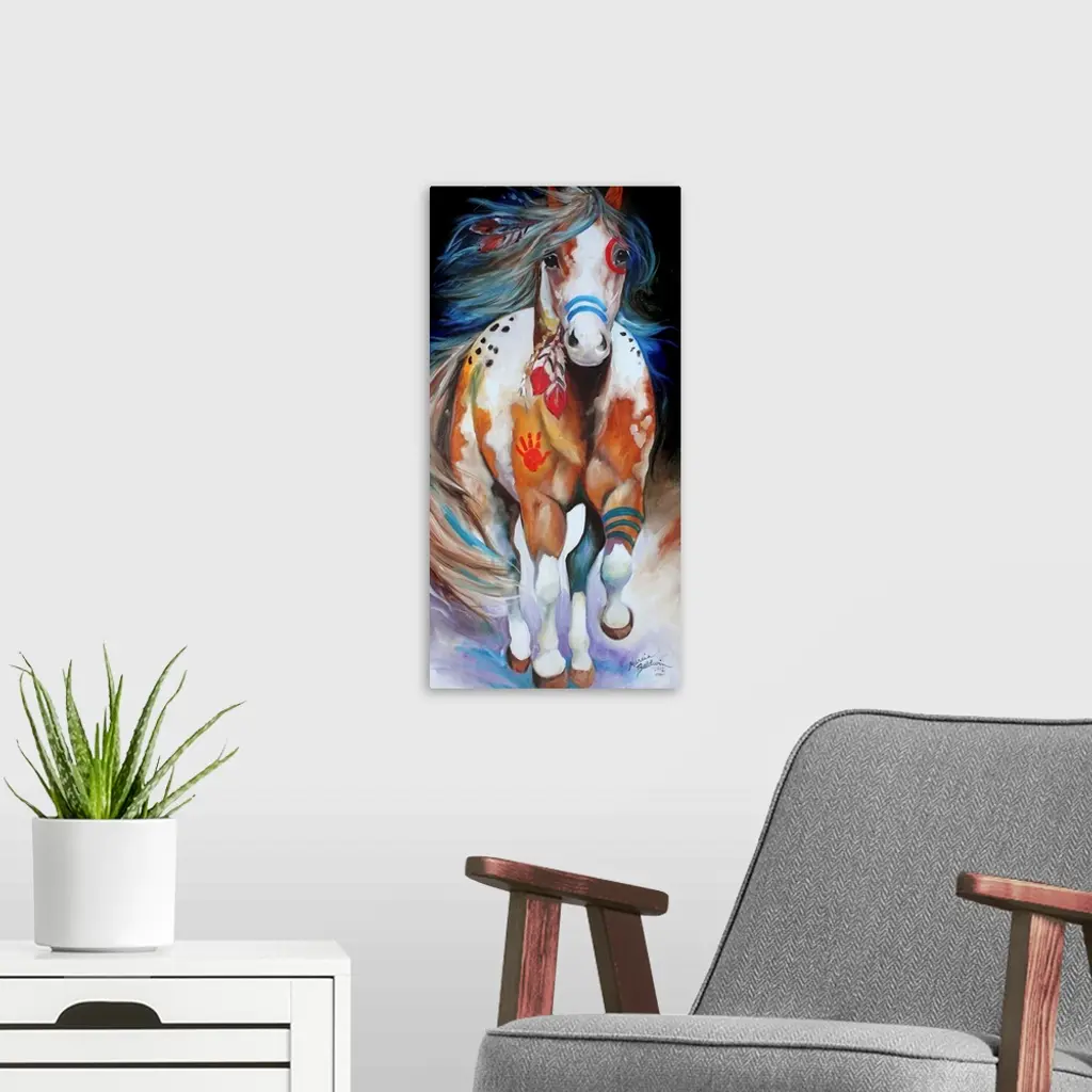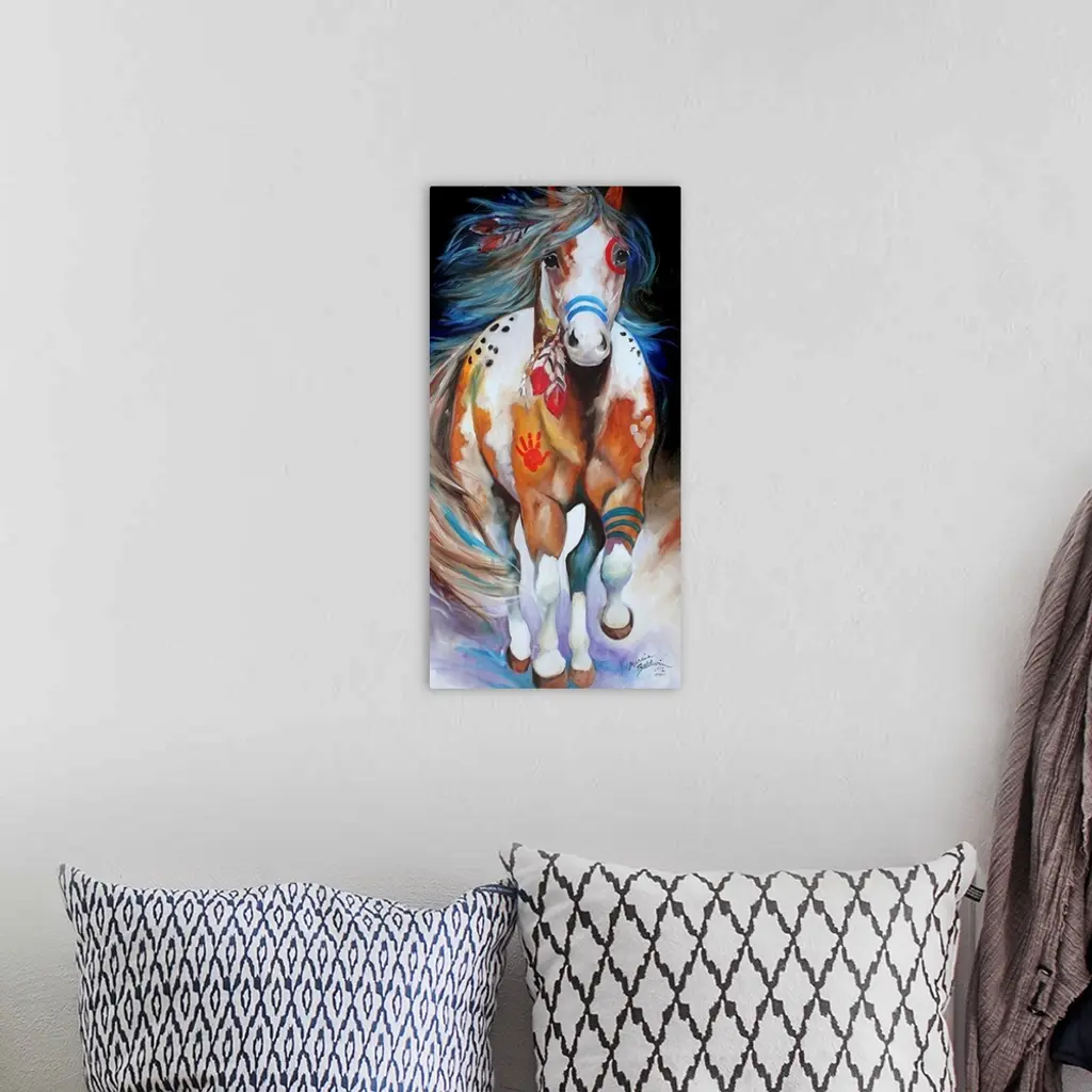 Panel painting of an Indian War Horse in action with red and blue body paint and feathers in its mane.