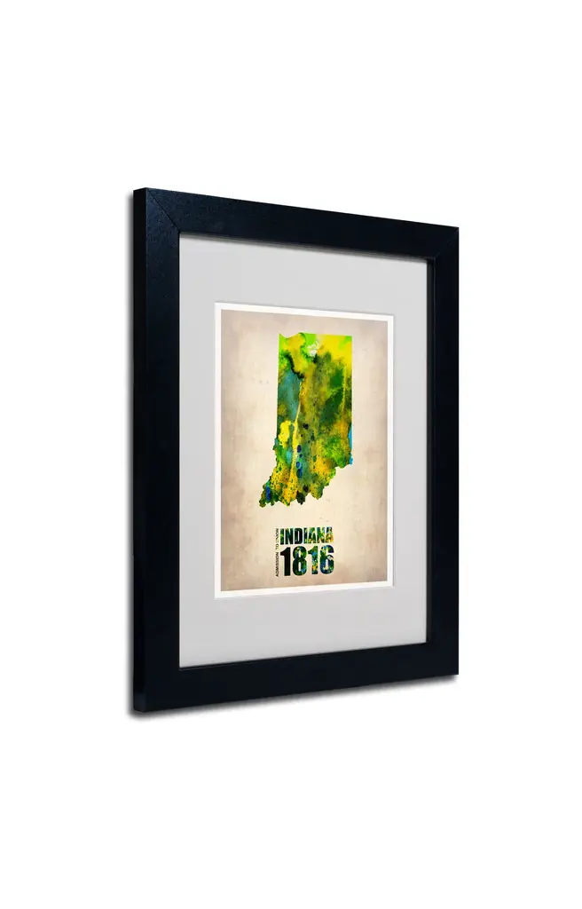 Title: Indiana Watercolor MapArtist: NaxartProduct Type: Matted Framed Canvas ArtMatte Color: WhiteFrame Color: BlackSize: 11" x 14"Made in the USA.Naxart is a group of creative professionals with diverse backgrounds in architecture, interior design, art, automotive design, and photography.All of the workers are passionate about their fields of expertise as well as art and design in general.Instead of a traditional approach of associating art with a specific artist, NaxArt chose to create a brand that represents their own values and vision rather than promoting individual agendas.NaxArt chose not to work with established art galleries that often demand price point to be higher than most people can afford, but rather they create their work for people like educated, metropolitan, informed, sophisticated professionals that have taste and desire to live in a modern unique environment and want their art to represent these qualities.They also work with architects and interior designers looking for unique art work for projects ranging from a small NYC studio design to large scale corporate development projects.An 8" x 10" giclee print under acrilyic in an 11" x 14" Black Frame.Giclee (jee-clay) is an advanced printmaking process for creating museum quality fine art reproductions.This high quality print is matted usingWhite Matting and comes in a Black Frame.A clear acrylic facing is added to protect the print.The piece is fully assembled by professional framers and comes ready to hang.