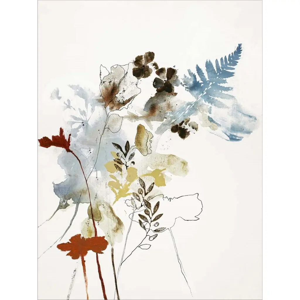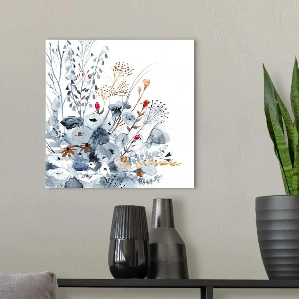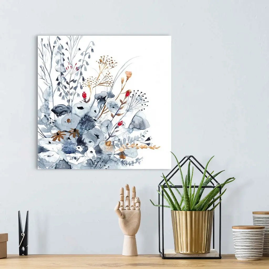 Square watercolor painting of indigo, orange, and red wildflowers.