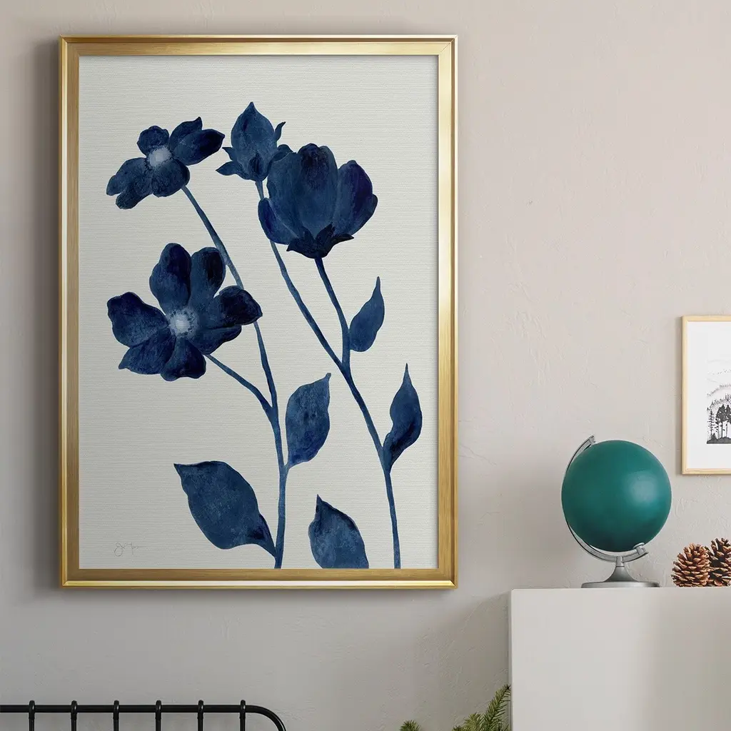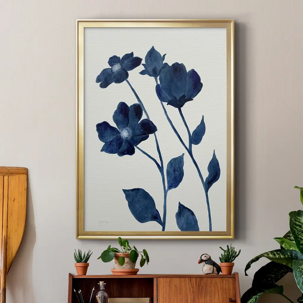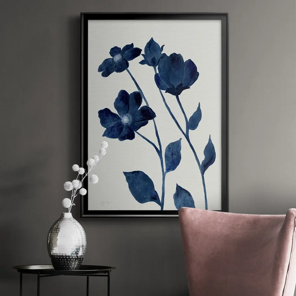 Indigo Bloom I Premium Framed Print - Ready to Hang A Premium Framed Print created to last. Framed in distressed wood and available in an array of sizes and colors Featuring a beveled a solid wood stretcher bar, each piece comes ready to hand 4 SIZES AVAILABLE 30.5''X42.5'' - Overall Size 26.5'X36.5'' - Overall Size 22.5''x30.5'' - Overall Size 18.5''x24.5'' - Overall Size Each piece is made to order. Each piece comes with hanging hardware. Made in the USA Ready to Hang
