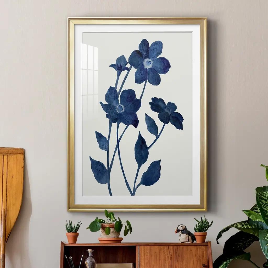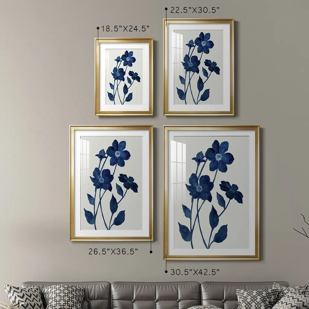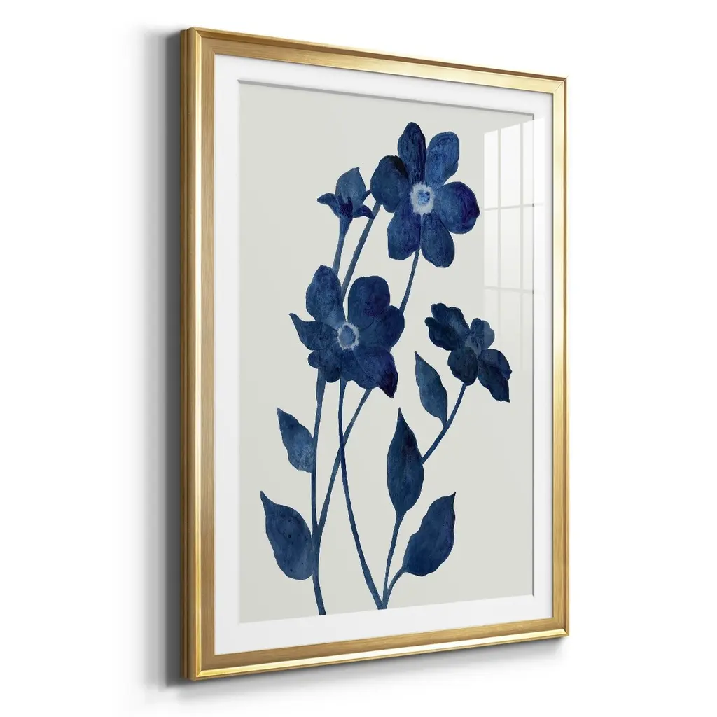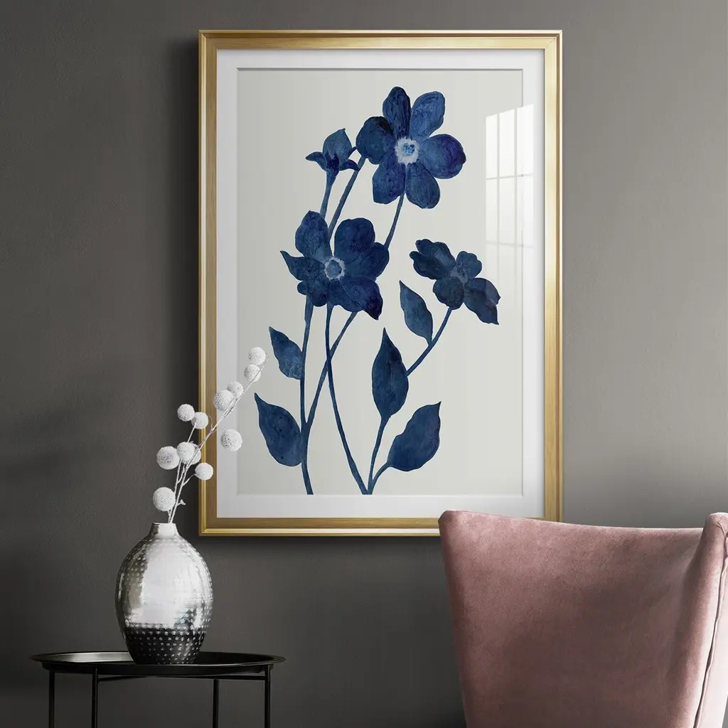 Indigo Bloom II Premium Framed Print - Ready to Hang A Premium Framed Print created to last. Framed in distressed wood and available in an array of sizes and colors Featuring a beveled a solid wood stretcher bar, each piece comes ready to hand 4 SIZES AVAILABLE 30.5''X42.5'' - Overall Size 26.5'X36.5'' - Overall Size 22.5''x30.5'' - Overall Size 18.5''x24.5'' - Overall Size Each piece is made to order. Each piece comes with hanging hardware. Made in the USA Ready to Hang Giclee Paper Print Acrylic Glass Beveled Matt Board