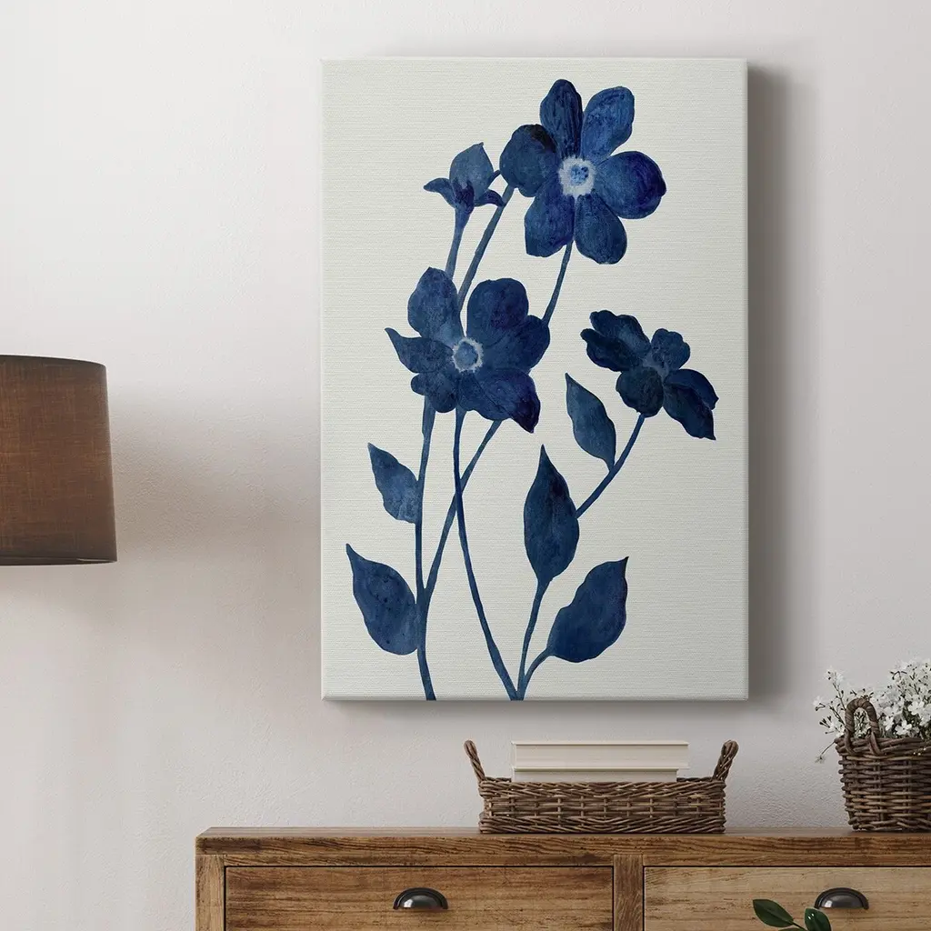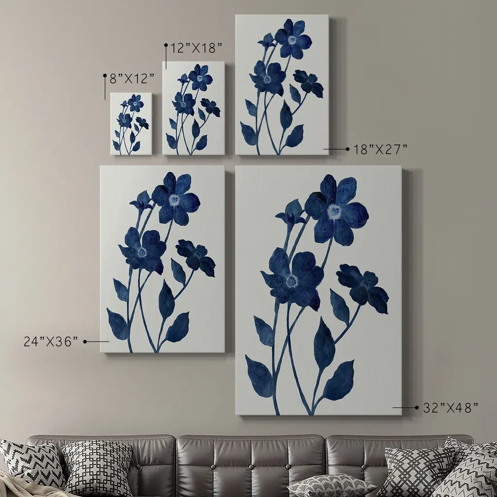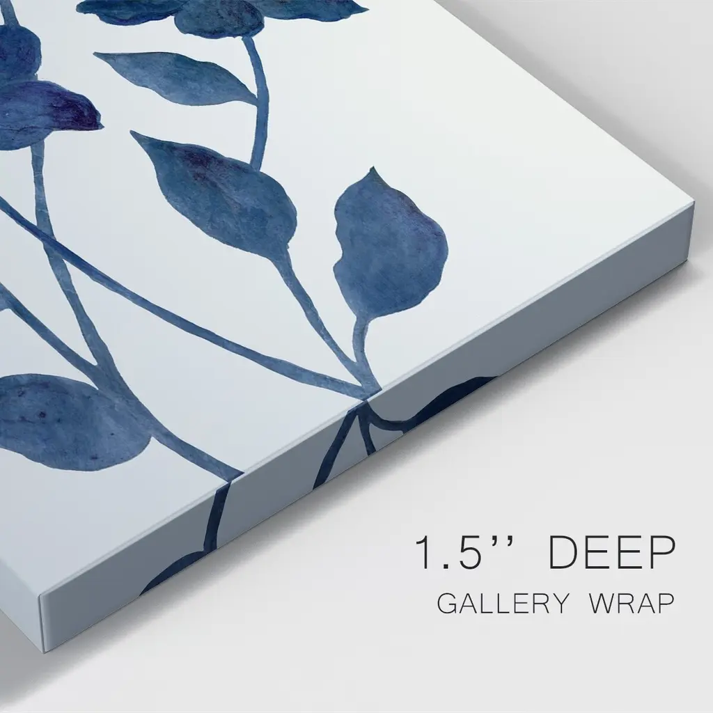 Indigo Bloom II Premium Gallery Wrapped Canvas - Ready to Hang A premium hand stretched gallery wrapped canvas print created to last. Featuring a beveled a solid wood stretcher bar, each piece comes ready to hand 6 SIZES AVAILABLE 8''X12'' - Overall Size 12''X18'' - Overall Size 18''X27'' - Overall Size 24''x36'' - Overall Size 32''x48'' - Overall Size 40''x60'' - Overall Size Each piece is made to order. Built to Last Each piece comes ready to hang Solid wood stretcher Fade and Water resistant Made domestically