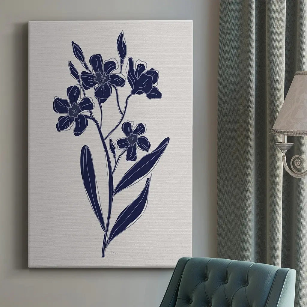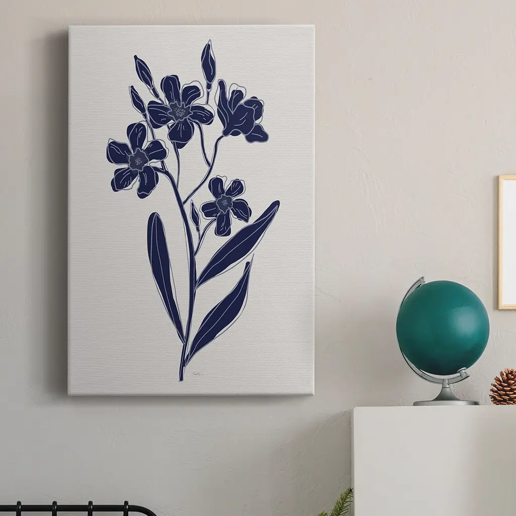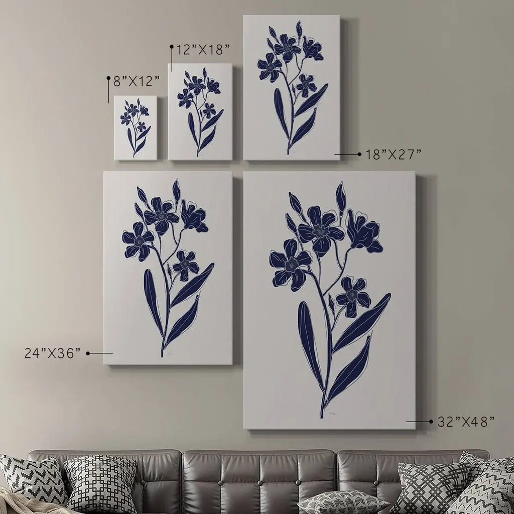 Indigo Botanical Study II Premium Gallery Wrapped Canvas - Ready to Hang A premium hand stretched gallery wrapped canvas print created to last. Featuring a beveled a solid wood stretcher bar, each piece comes ready to hand 6 SIZES AVAILABLE 8''X12'' - Overall Size 12''X18'' - Overall Size 18''X27'' - Overall Size 24''x36'' - Overall Size 32''x48'' - Overall Size 40''x60'' - Overall Size Each piece is made to order. Built to Last Each piece comes ready to hang Solid wood stretcher Fade and Water resistant Made domestically