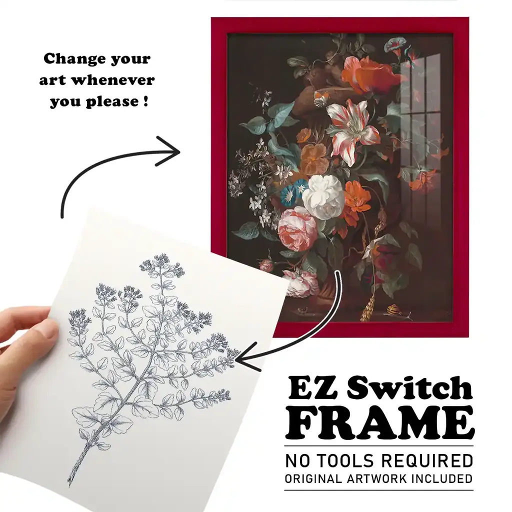 Indigo Botany Study VI -EZ SWITCH Framed Print w/glass-Cherry Red A delightful, framed print. Featuring a solid wood frame with real wood glass. This premium print is giclee quality. In addition, every frame features a removable back and table top stand. This allows you to change your art in the future or to just stand the art on a table for a new look. We are sure you'll enjoy our new series of EZ SWITCH Framed Art. Solid Wood Frame Real Glass Removable / Replaceable Art Built in Tabletop Stand Sizes range from 4x6 up to 12x15 - buy just one or pair them up as sets as you see fit.