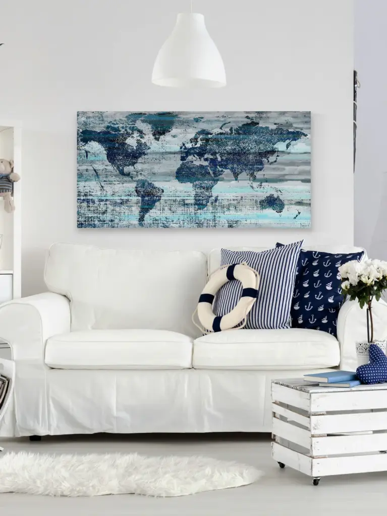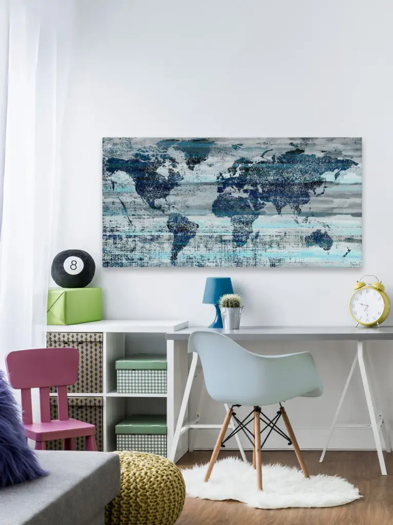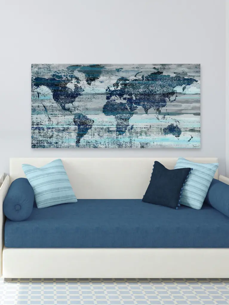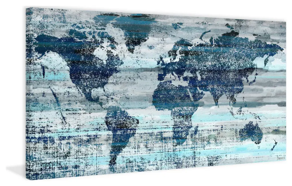 This world map watercolor print is done in various shades of blue, printed similar to a screen print. Its colors and subtle style can go well with any decor. Proudly made in the USA, this piece is printed on canvas before it''s stretched over non-warping wooden bars for a gallery-wrapped look. With wall-mounting hooks included, this artful accent is ready to hang up as soon as it reaches your front door.• Durable art print on high quality canvas• Professionally hand stretched• Arrives ready to hang• Gallery wrapped in sustainable, non-warping wood• Includes a certificate of authenticity• Artist signature on the front• Made in the USA