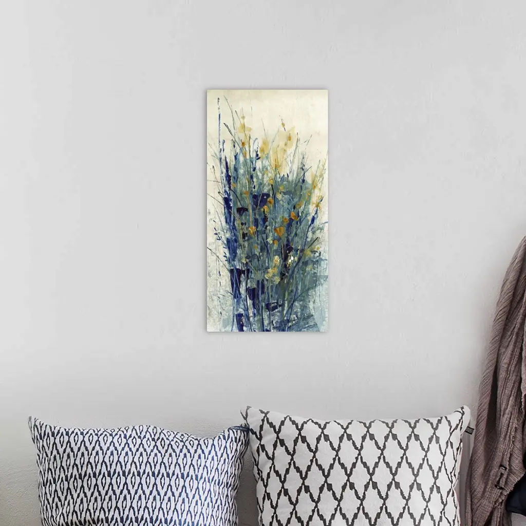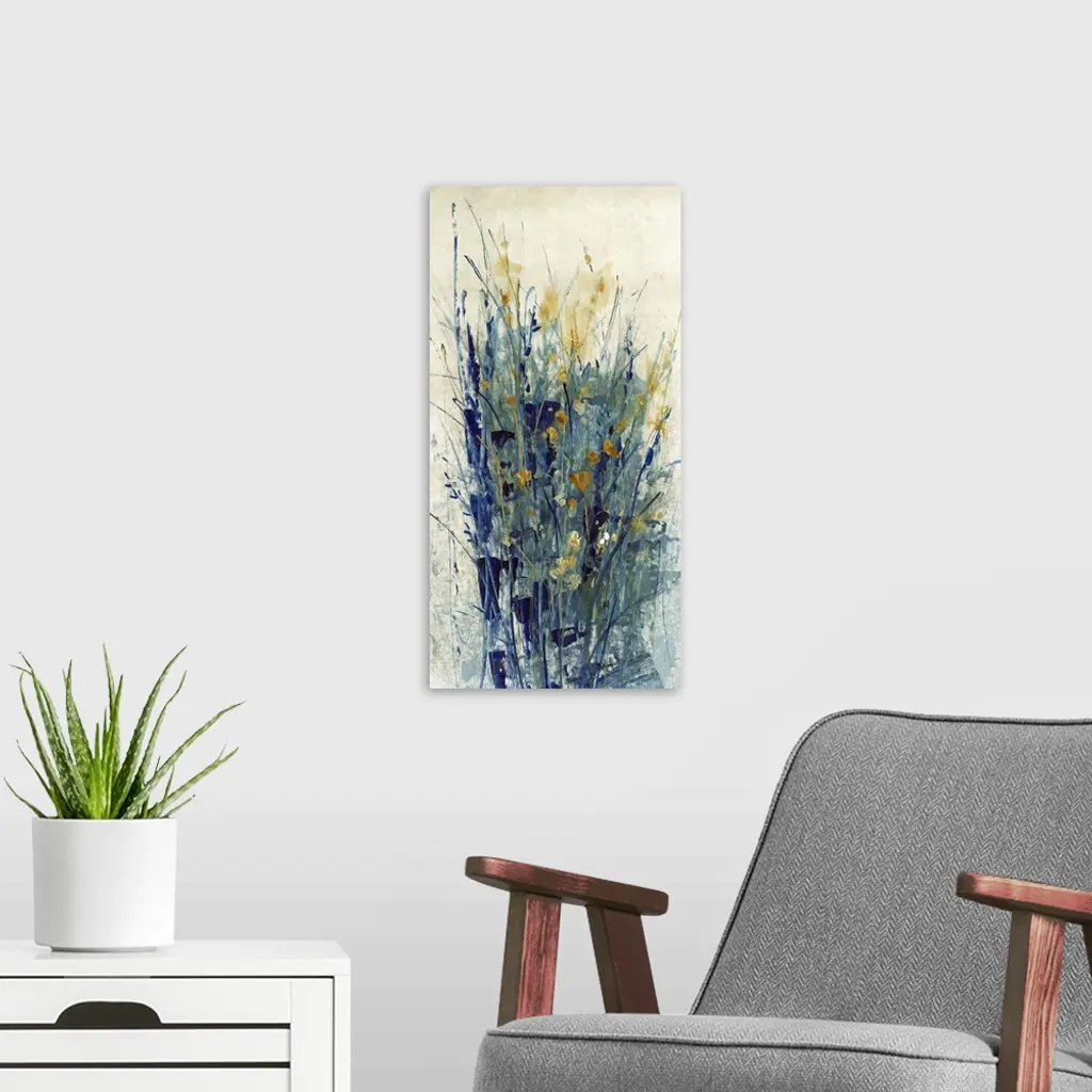 Contemporary abstract artwork using dark cool tones in wispy line strokes creating what looks like grass and flowers.