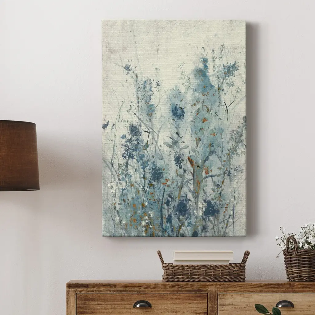 An abstract bouquet is captured in rich shades of indigo, green and yellow, while a high-gloss finish adds a polished touch.