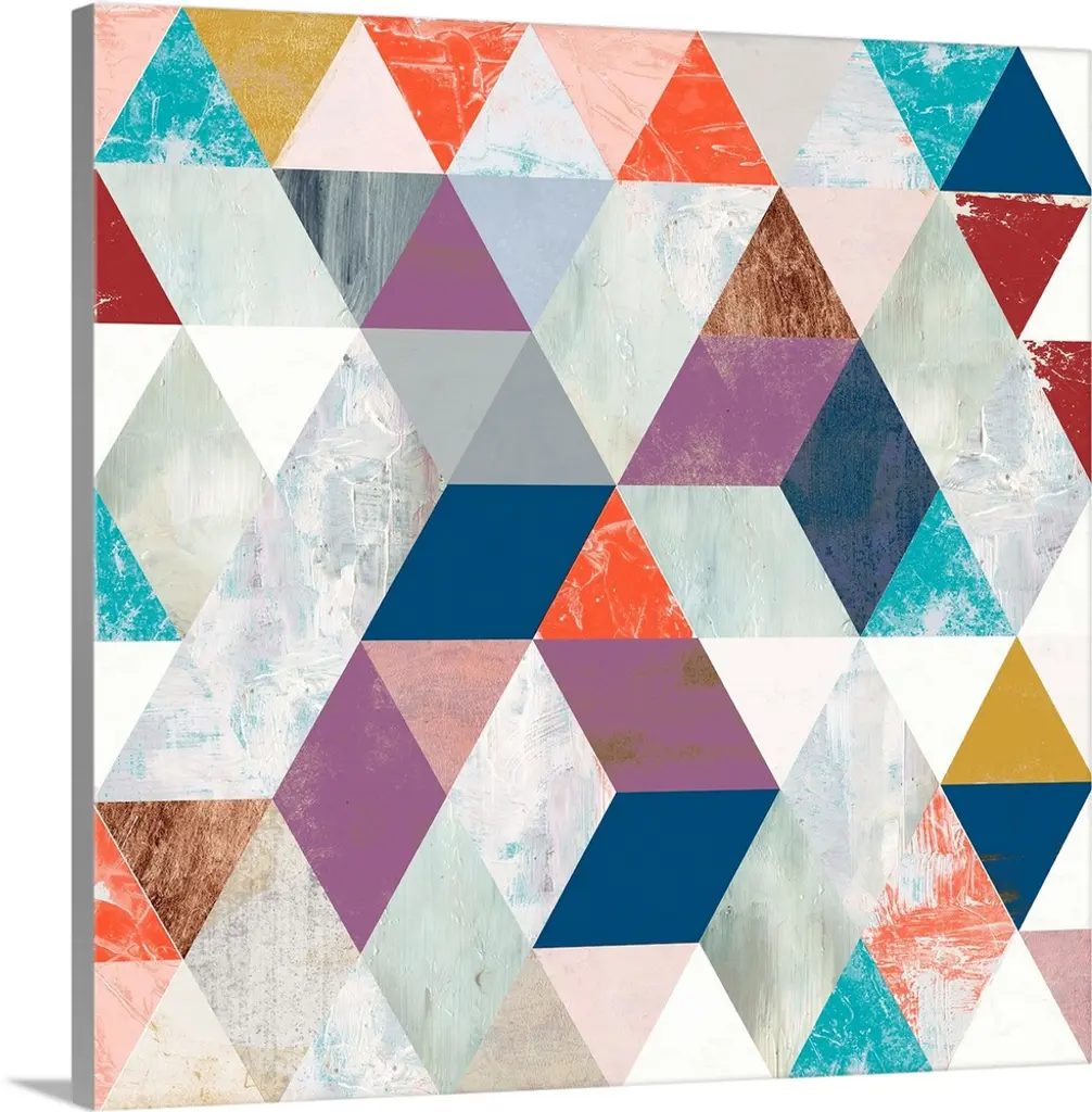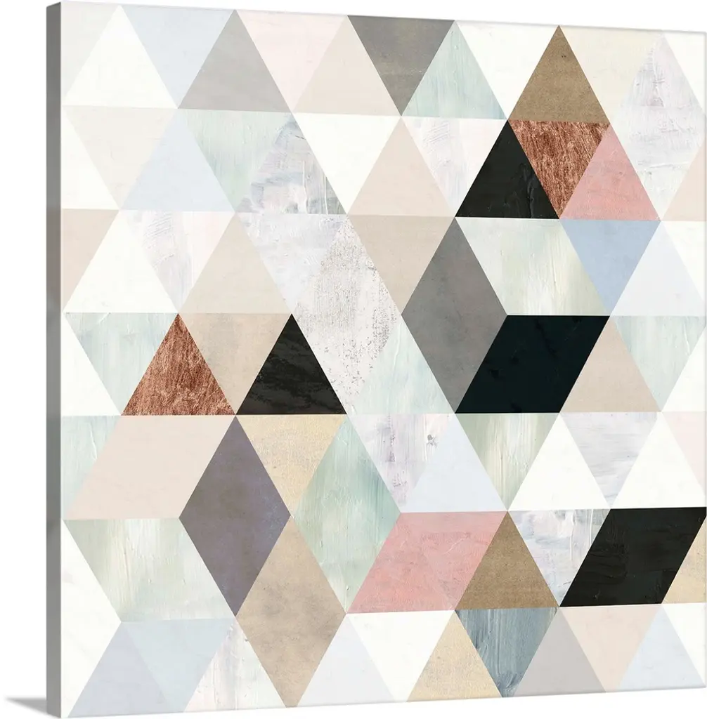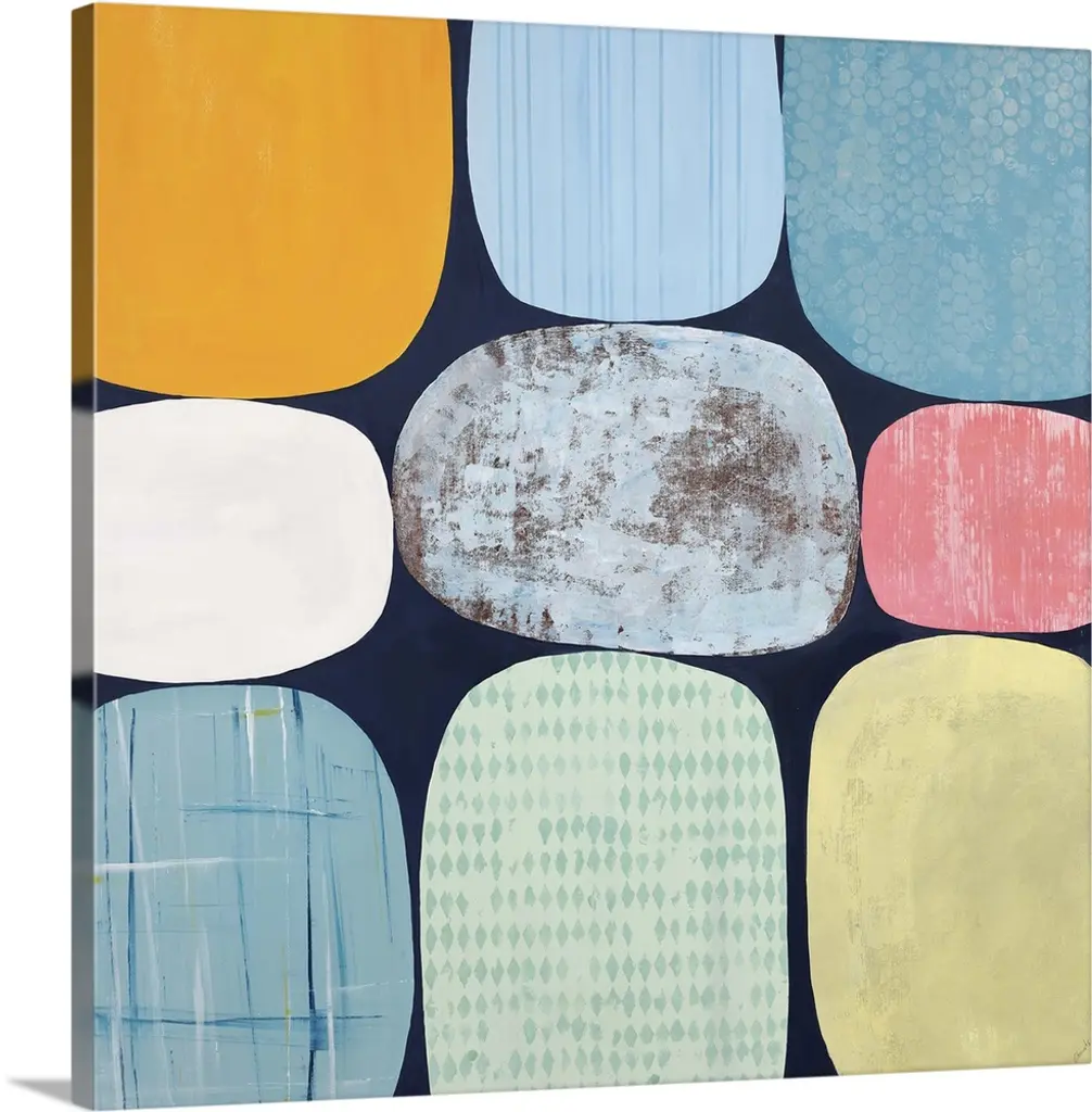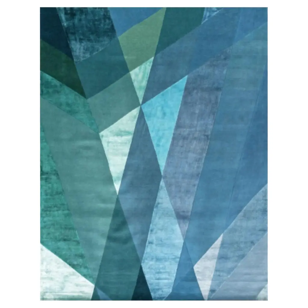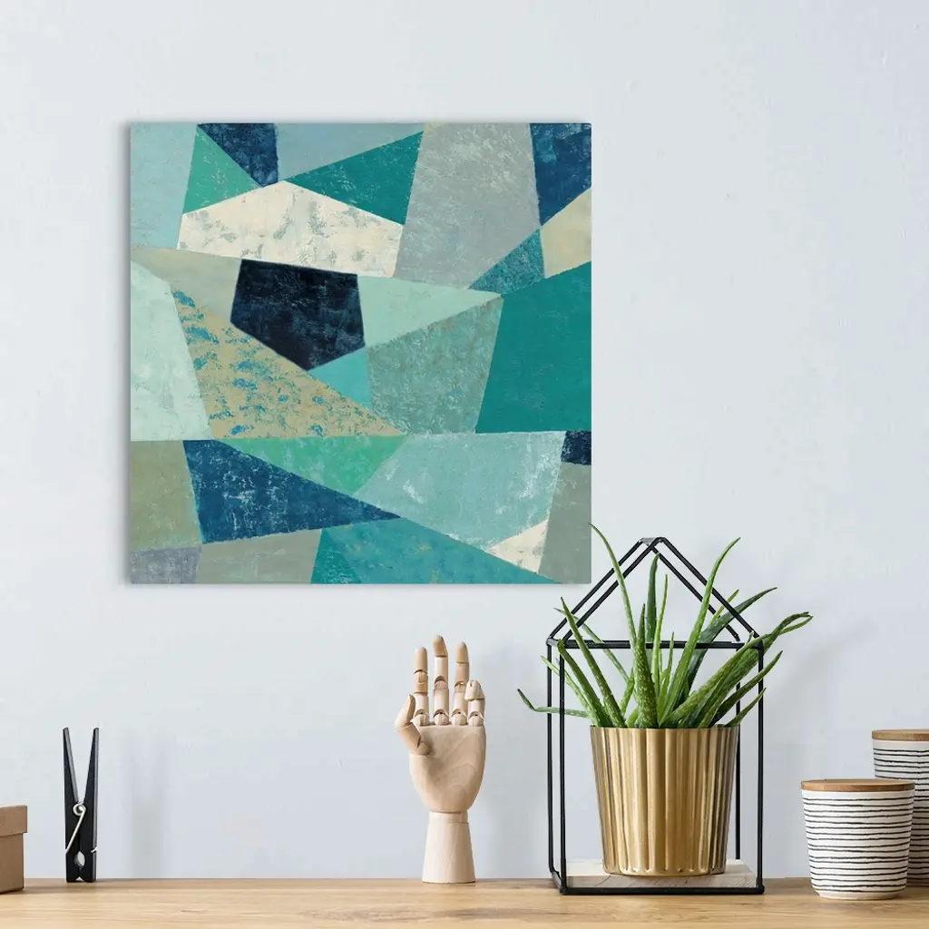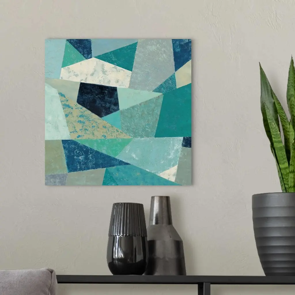 Contemporary geometric artwork using cool green and blue colors with a retro mid-century vibe.