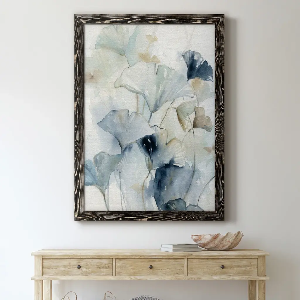 Indigo Ginkgo I-Premium Framed Canvas - Ready to Hang Framed in distressed wood and available in an array of sizes and colors Each piece is joined and assembled by hand and comes ready to hang FRAMED GICLEE CANVAS HAND STRETCHED GALLERY WRAPPED CANVAS READY TO HANG MADE IN THE USA SOLID WOOD FRAME MADE IN USA FADE RESISTANT GICLEE PRINTING on Canvas