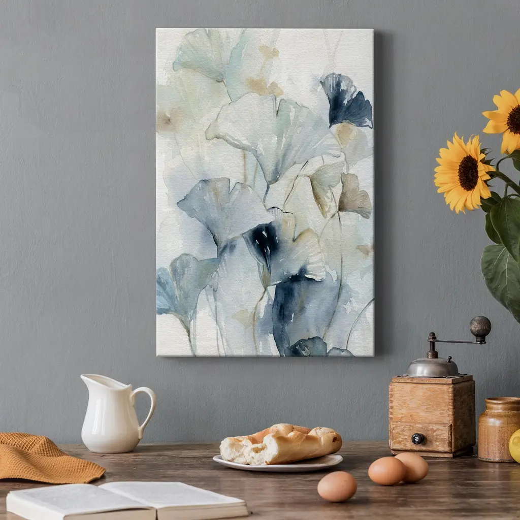 Indigo Ginkgo I Premium Gallery Wrapped Canvas - Ready to Hang A premium hand stretched gallery wrapped canvas print created to last. Featuring a beveled a solid wood stretcher bar, each piece comes ready to hand 5 SIZES AVAILABLE 8''X12'' - Overall Size 16'X20'' - Overall Size 24''x32'' - Overall Size 30''x40'' - Overall Size 36''x48'' - Overall Size Each piece is made to order. Built to Last Each piece comes ready to hang Solid wood stretcher Fade and Water resistant Made domestically