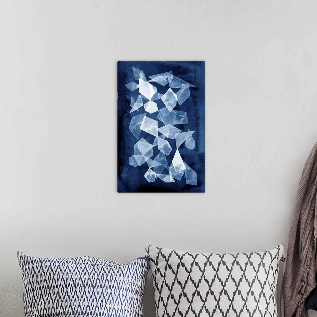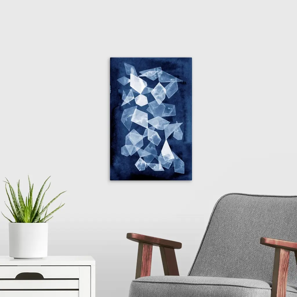 This contemporary artwork features white geometric shapes that resemble falling shards of glass over a dark blue background.