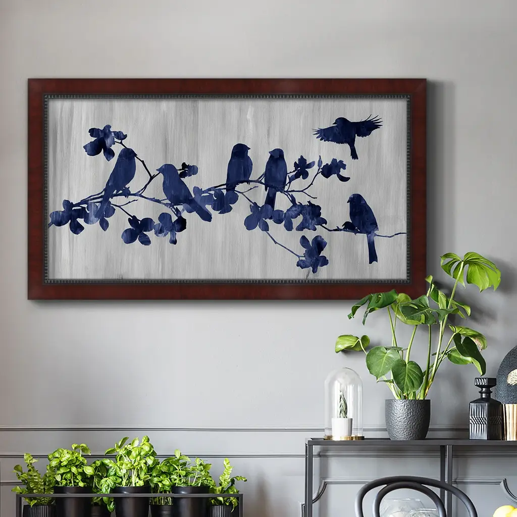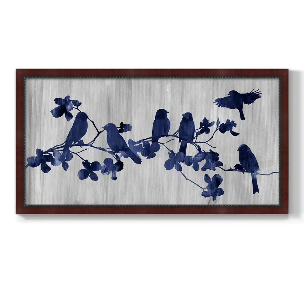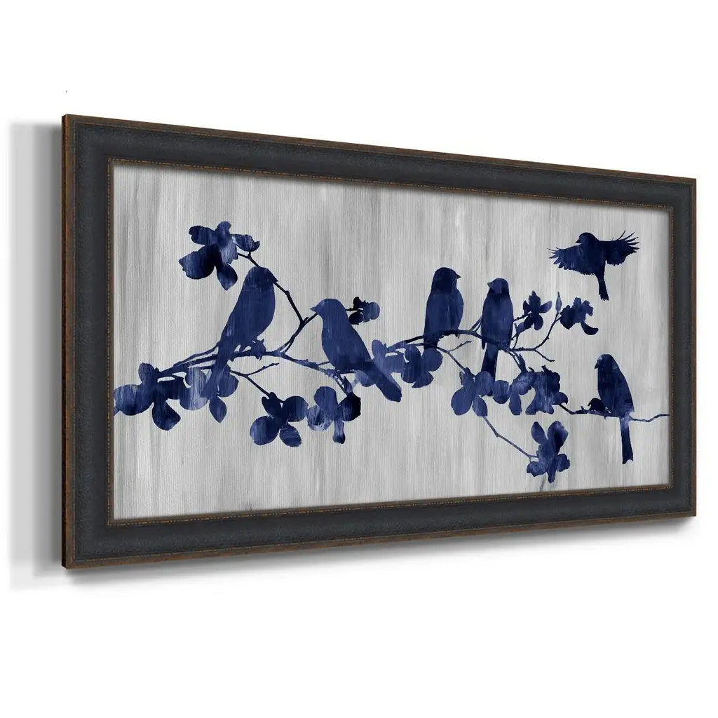 Indigo Hangout Premium Framed Canvas- Ready to Hang A Premium Framed Canvas created to last. Framed in distressed wood and available in an array of sizes and colors Featuring a beveled a solid wood stretcher bar, each piece comes ready to hand 3 SIZES AVAILABLE 21''X37'' - Overall Size 25''X45'' - Overall Size 29''x53'' - Overall Size Each piece is made to order. Each piece comes with hanging hardware. Made in the USA Ready to Hang Giclee Paper Print Acrylic Glass Beveled Matt Board