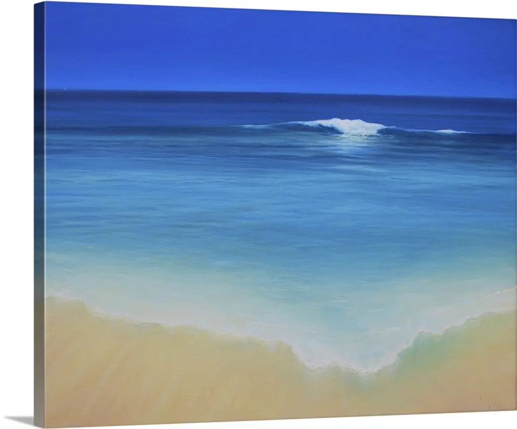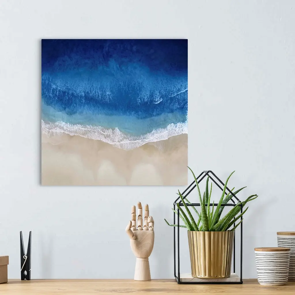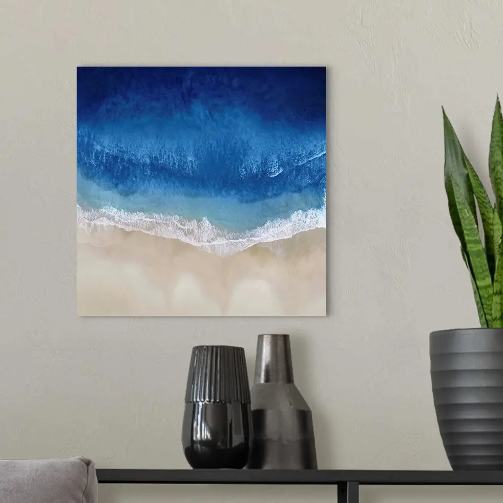One artwork in a series of aerial shots of a beach as dark blue waves break upon the shore.