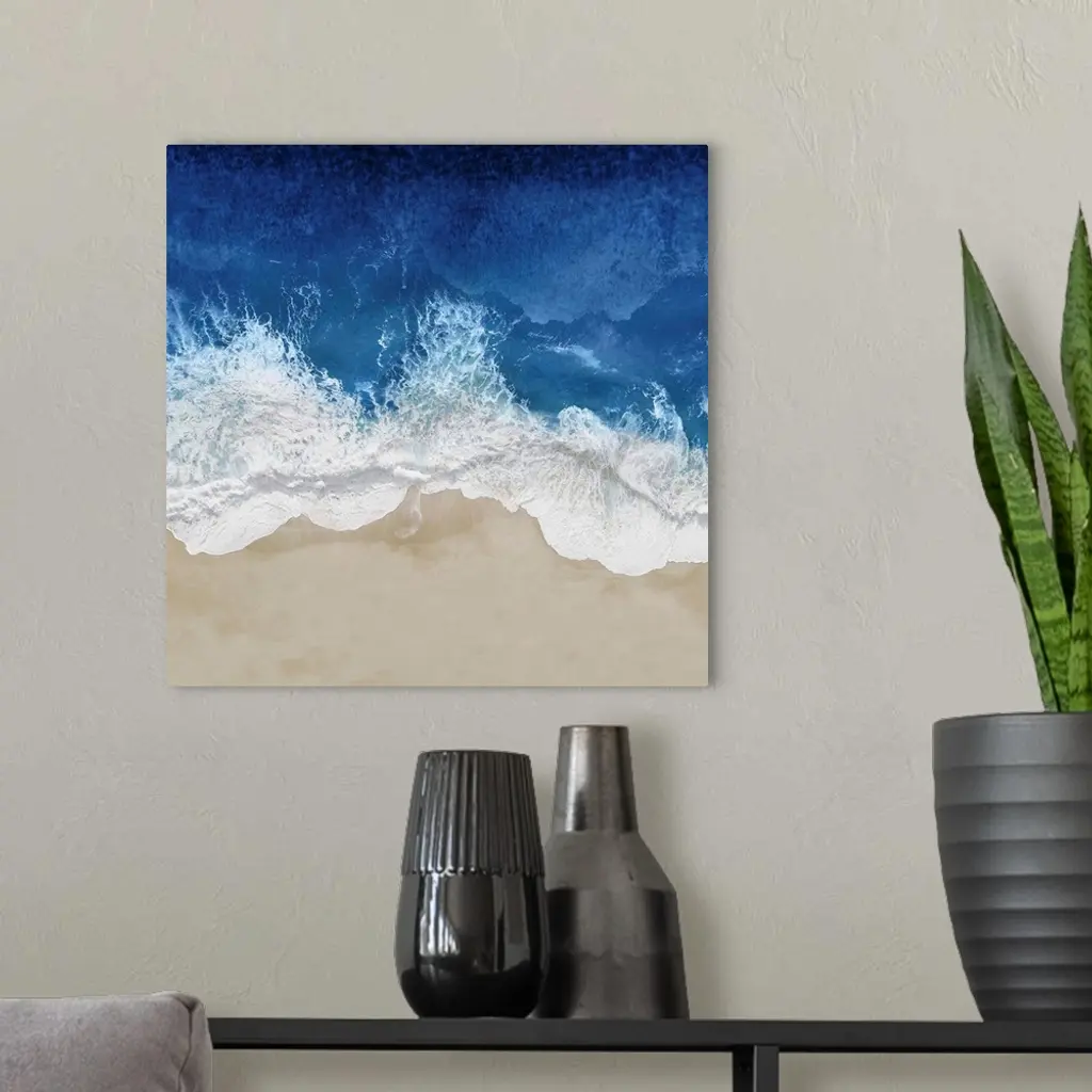 One artwork in a series of aerial shots of a beach as dark blue waves break upon the shore.