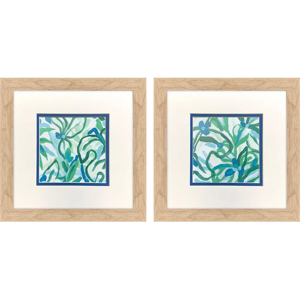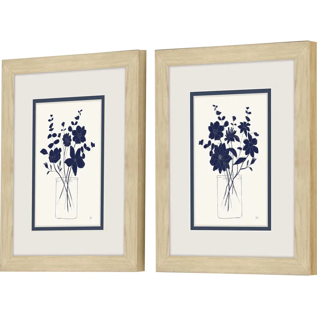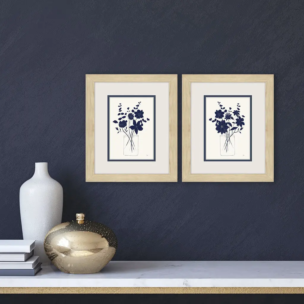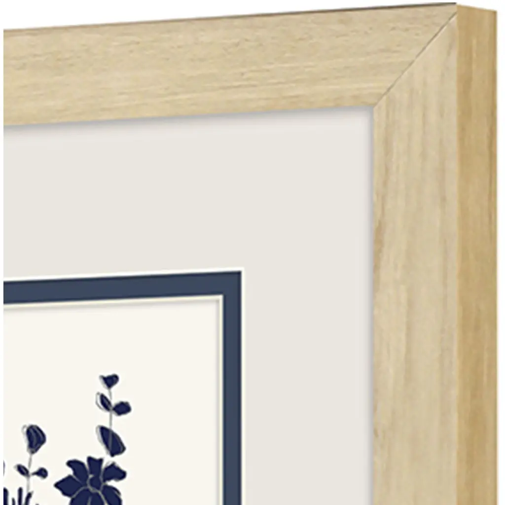 Blue flower stem sketches are matted in light buff and accented with navy blue matting. Framed in a natural wood finish moulding.
