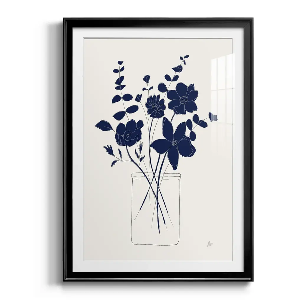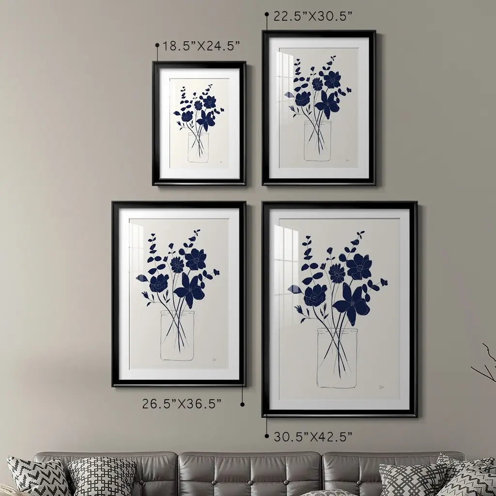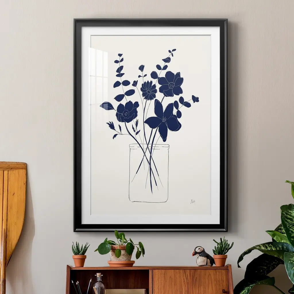 Indigo Sketch Bouquet I Premium Framed Print - Ready to Hang A Premium Framed Print created to last. Framed in distressed wood and available in an array of sizes and colors Featuring a beveled a solid wood stretcher bar, each piece comes ready to hand 4 SIZES AVAILABLE 30.5''X42.5'' - Overall Size 26.5'X36.5'' - Overall Size 22.5''x30.5'' - Overall Size 18.5''x24.5'' - Overall Size Each piece is made to order. Each piece comes with hanging hardware. Made in the USA Ready to Hang Giclee Paper Print Acrylic Glass Beveled Matt Board