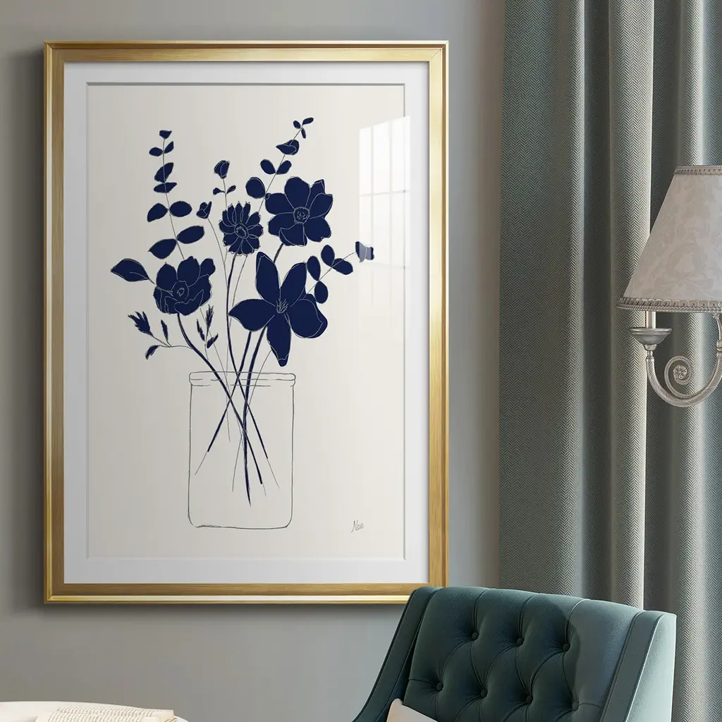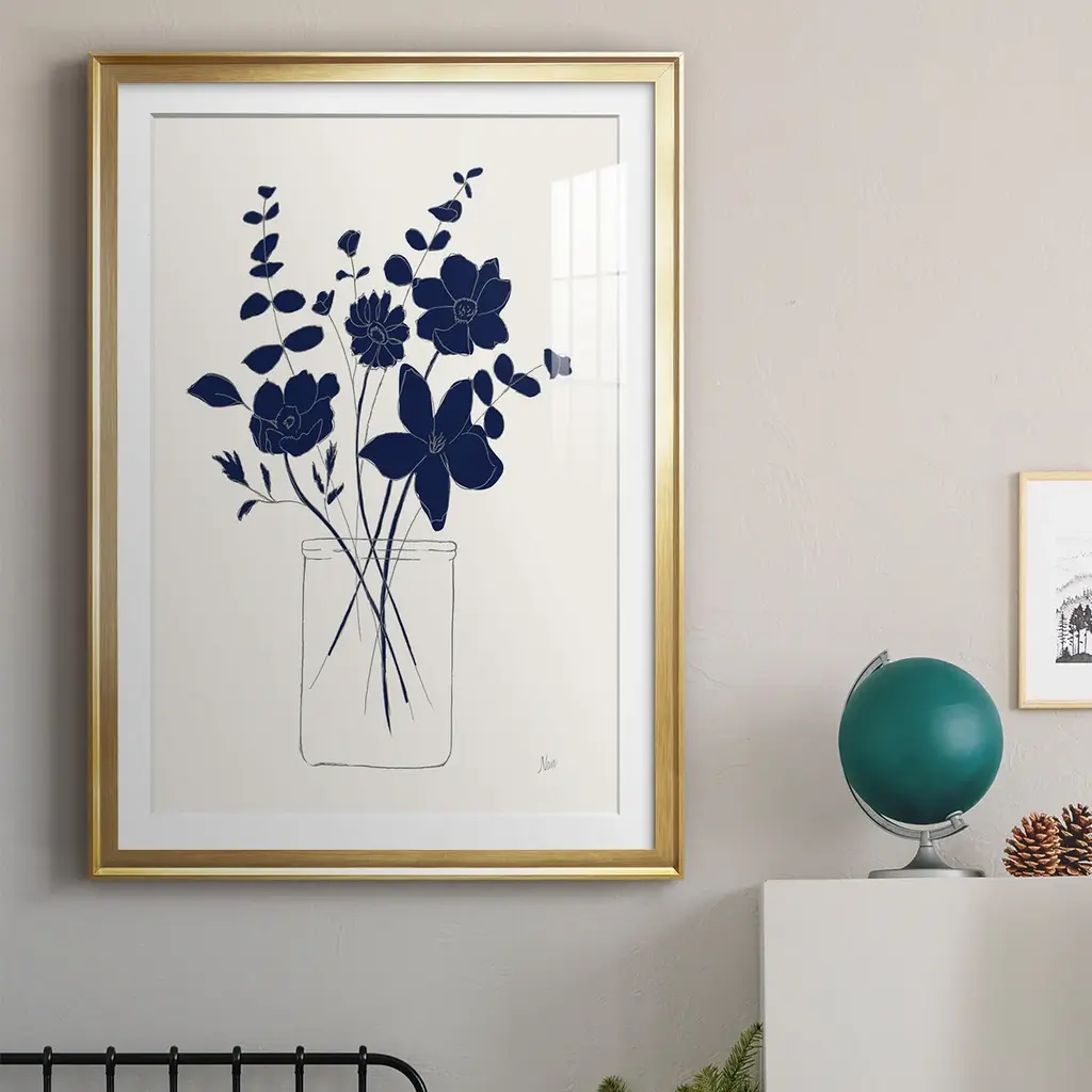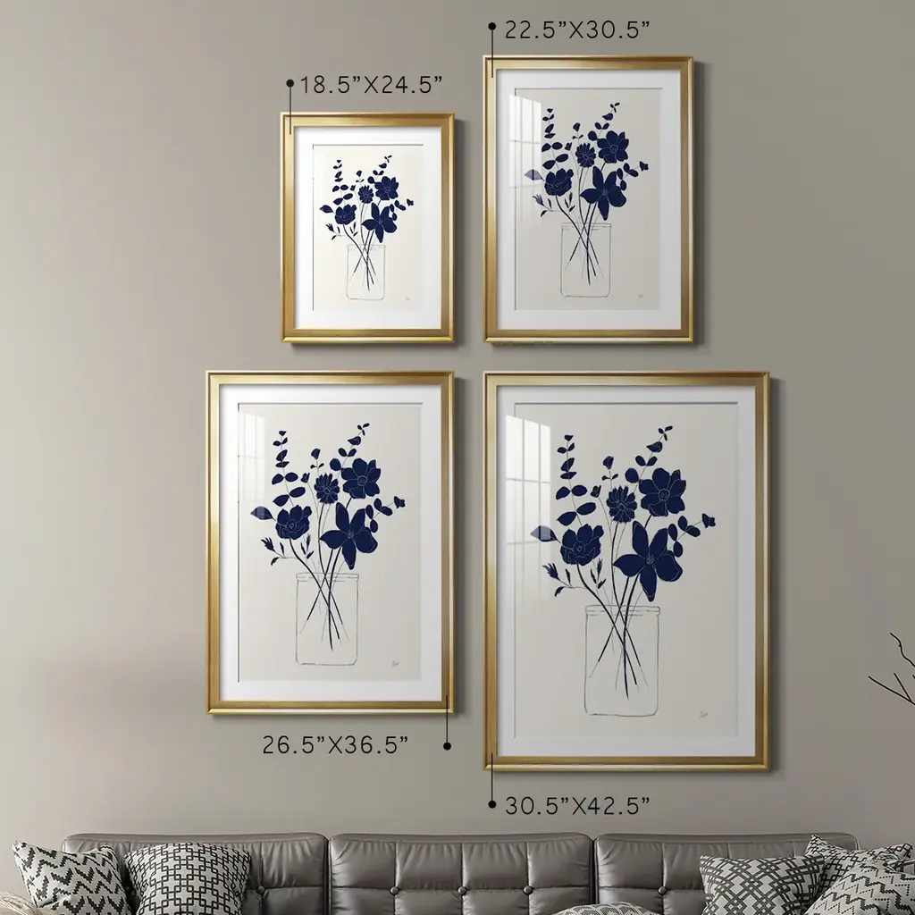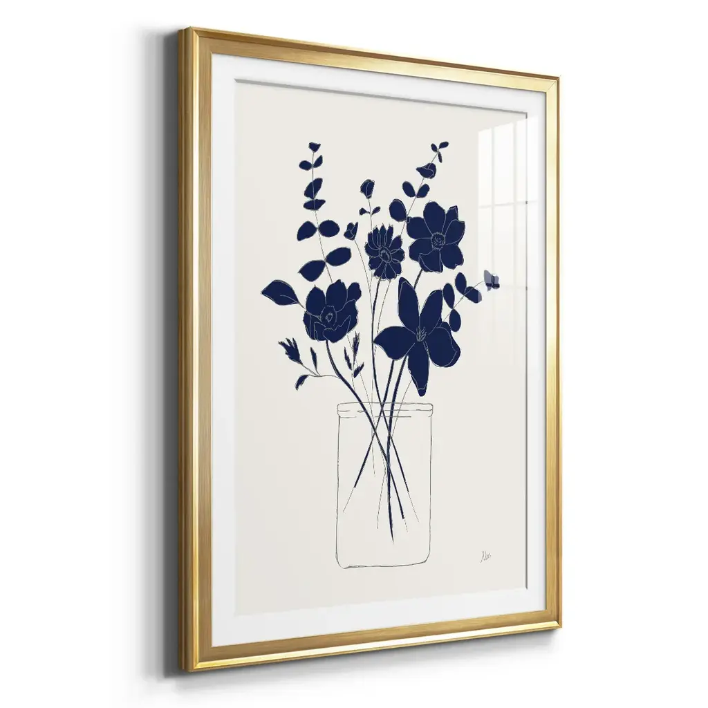 Indigo Sketch Bouquet I Premium Framed Print - Ready to Hang A Premium Framed Print created to last. Framed in distressed wood and available in an array of sizes and colors Featuring a beveled a solid wood stretcher bar, each piece comes ready to hand 4 SIZES AVAILABLE 30.5''X42.5'' - Overall Size 26.5'X36.5'' - Overall Size 22.5''x30.5'' - Overall Size 18.5''x24.5'' - Overall Size Each piece is made to order. Each piece comes with hanging hardware. Made in the USA Ready to Hang Giclee Paper Print Acrylic Glass Beveled Matt Board