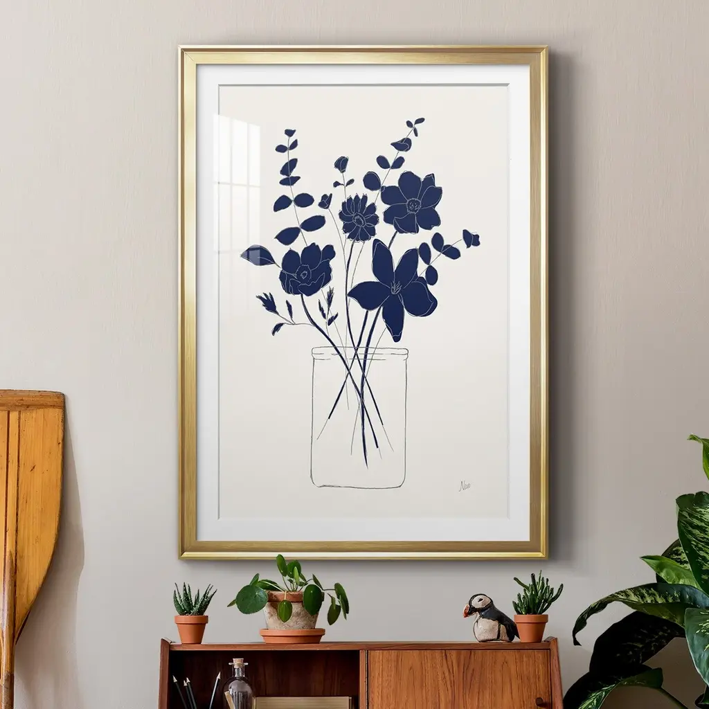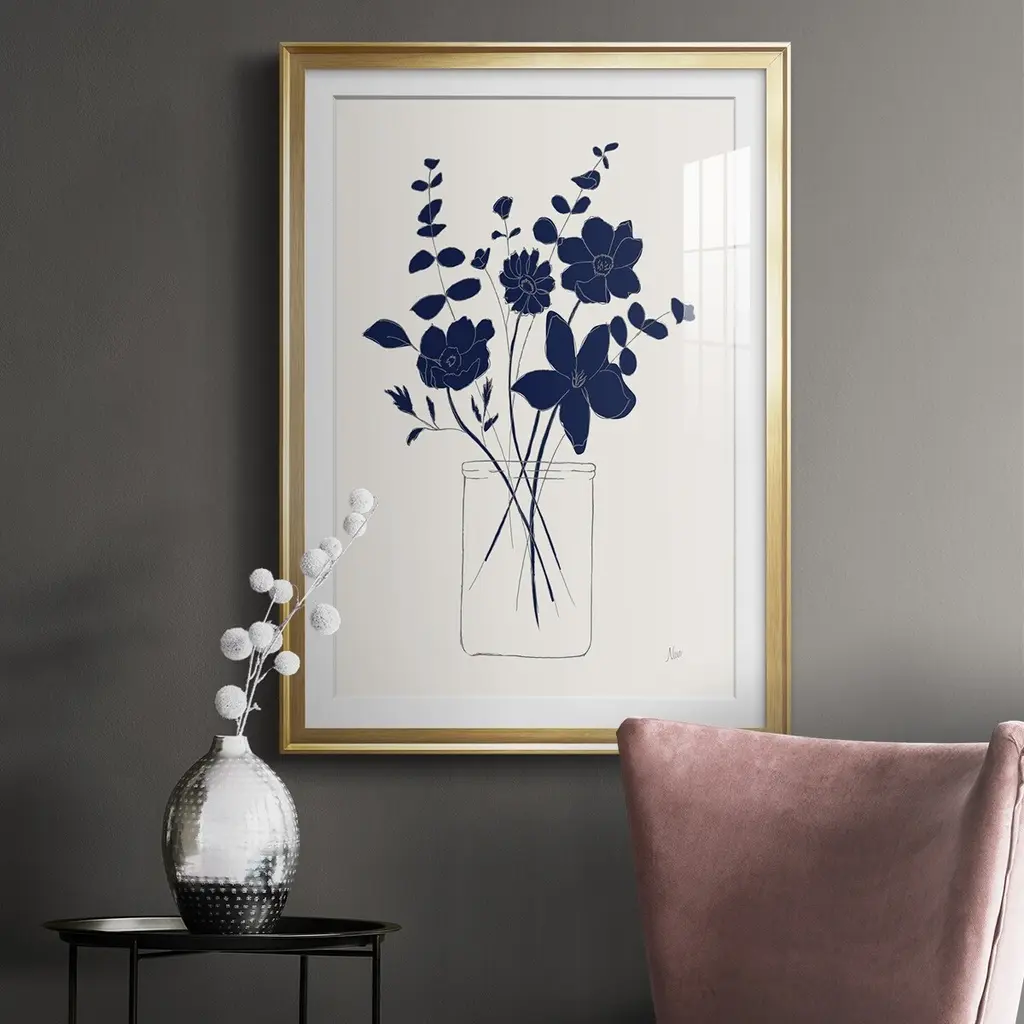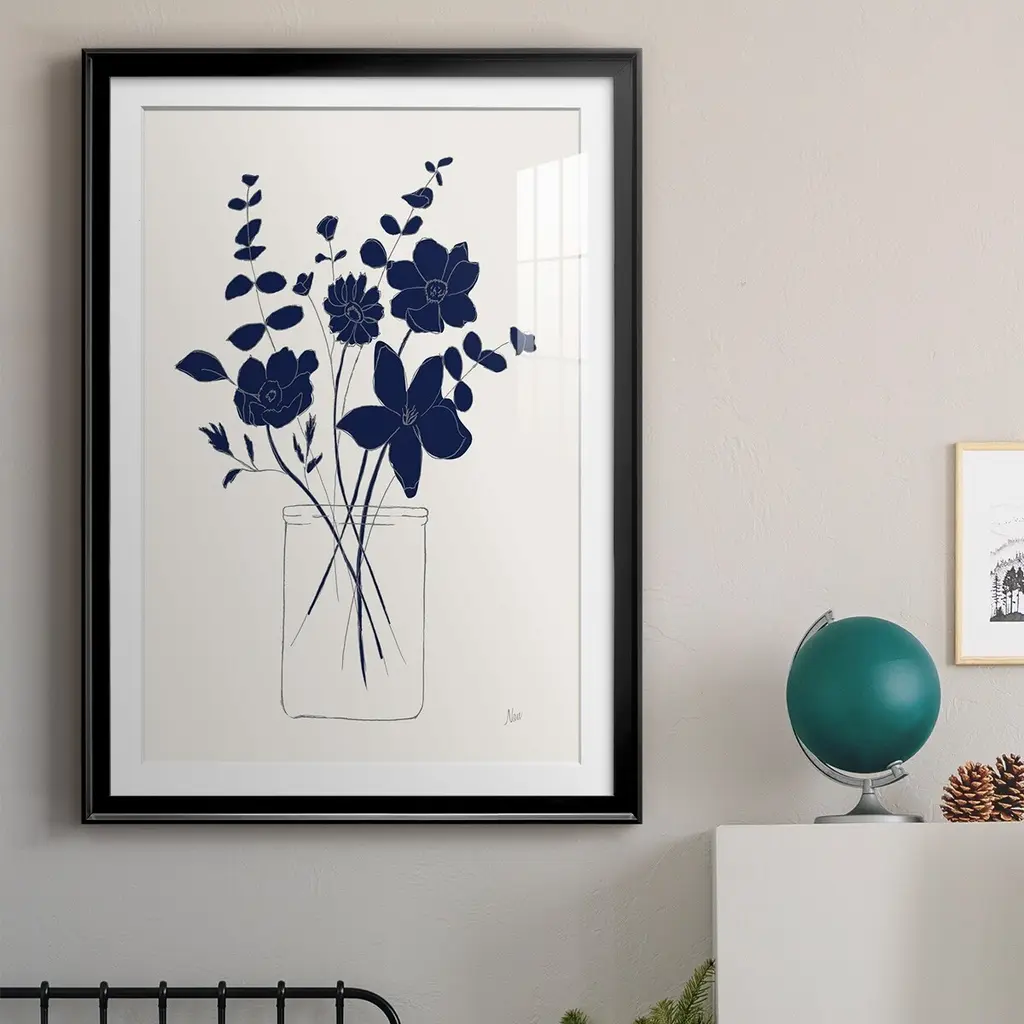 Indigo Sketch Bouquet I Premium Framed Print - Ready to Hang A Premium Framed Print created to last. Framed in distressed wood and available in an array of sizes and colors Featuring a beveled a solid wood stretcher bar, each piece comes ready to hand 4 SIZES AVAILABLE 30.5''X42.5'' - Overall Size 26.5'X36.5'' - Overall Size 22.5''x30.5'' - Overall Size 18.5''x24.5'' - Overall Size Each piece is made to order. Each piece comes with hanging hardware. Made in the USA Ready to Hang Giclee Paper Print Acrylic Glass Beveled Matt Board