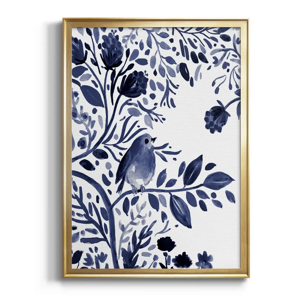 Indigo Song I Premium Framed Print - Ready to Hang A Premium Framed Print created to last. Framed in distressed wood and available in an array of sizes and colors Featuring a beveled a solid wood stretcher bar, each piece comes ready to hand 4 SIZES AVAILABLE 30.5''X42.5'' - Overall Size 26.5'X36.5'' - Overall Size 22.5''x30.5'' - Overall Size 18.5''x24.5'' - Overall Size Each piece is made to order. Each piece comes with hanging hardware. Made in the USA Ready to Hang