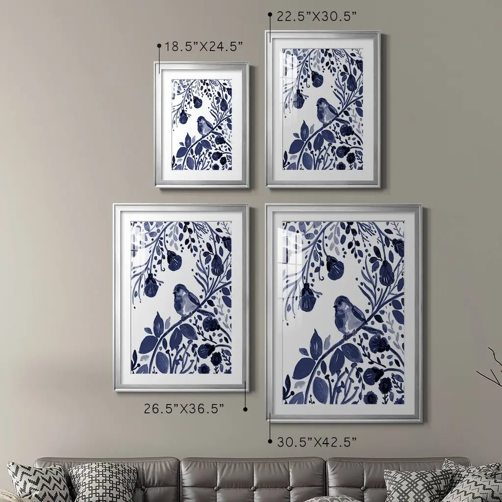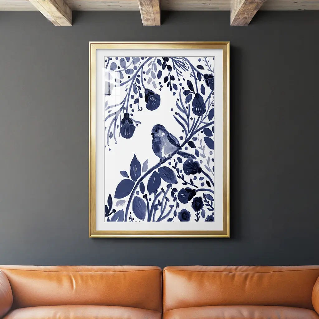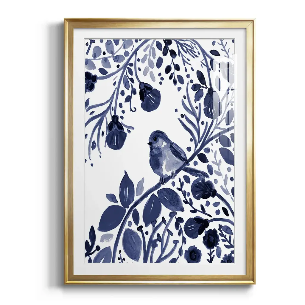 Indigo Song II Premium Framed Print - Ready to Hang A Premium Framed Print created to last. Framed in distressed wood and available in an array of sizes and colors Featuring a beveled a solid wood stretcher bar, each piece comes ready to hand 4 SIZES AVAILABLE 30.5''X42.5'' - Overall Size 26.5'X36.5'' - Overall Size 22.5''x30.5'' - Overall Size 18.5''x24.5'' - Overall Size Each piece is made to order. Each piece comes with hanging hardware. Made in the USA Ready to Hang Giclee Paper Print Acrylic Glass Beveled Matt Board