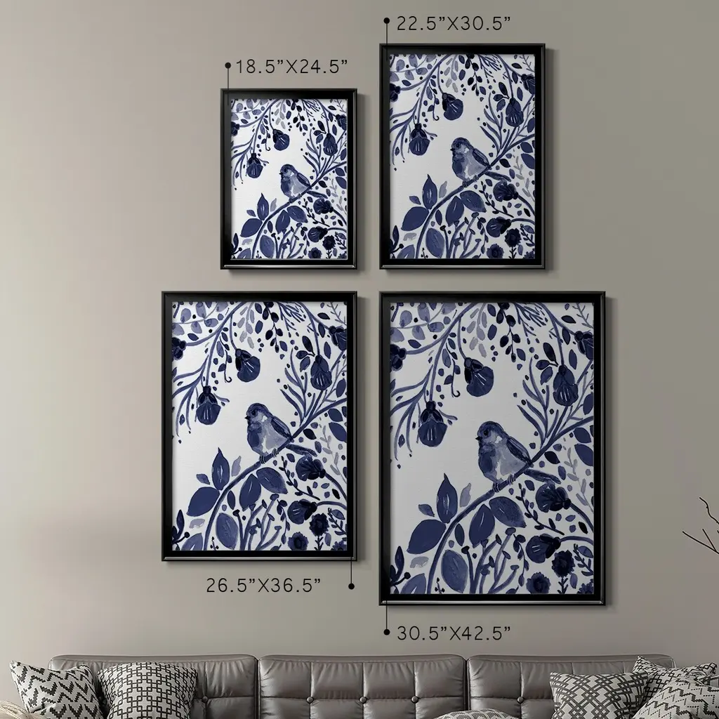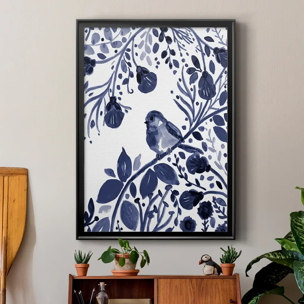 Indigo Song II Premium Framed Print - Ready to Hang A Premium Framed Print created to last. Framed in distressed wood and available in an array of sizes and colors Featuring a beveled a solid wood stretcher bar, each piece comes ready to hand 4 SIZES AVAILABLE 30.5''X42.5'' - Overall Size 26.5'X36.5'' - Overall Size 22.5''x30.5'' - Overall Size 18.5''x24.5'' - Overall Size Each piece is made to order. Each piece comes with hanging hardware. Made in the USA Ready to Hang