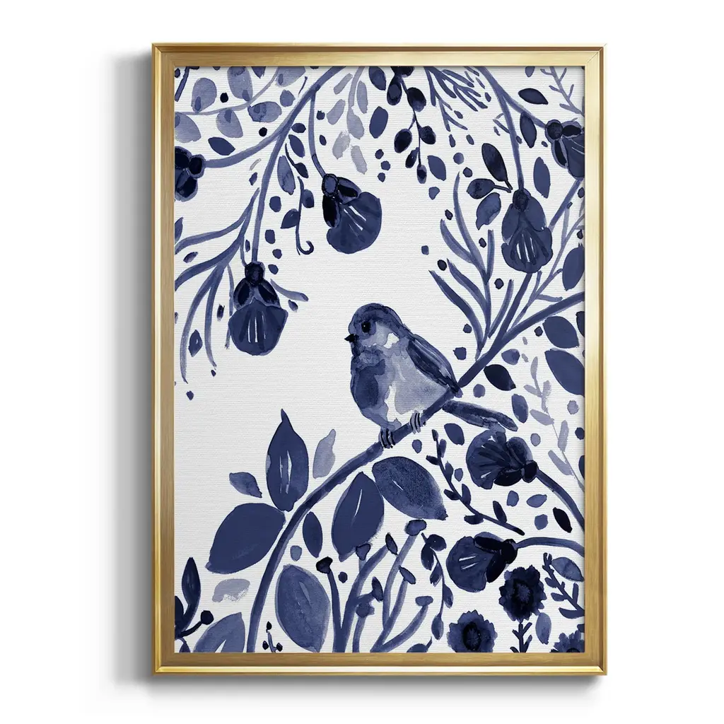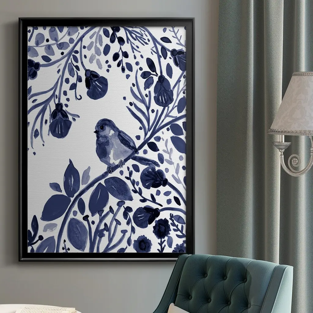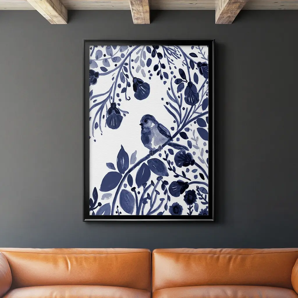 Indigo Song II Premium Framed Print - Ready to Hang A Premium Framed Print created to last. Framed in distressed wood and available in an array of sizes and colors Featuring a beveled a solid wood stretcher bar, each piece comes ready to hand 4 SIZES AVAILABLE 30.5''X42.5'' - Overall Size 26.5'X36.5'' - Overall Size 22.5''x30.5'' - Overall Size 18.5''x24.5'' - Overall Size Each piece is made to order. Each piece comes with hanging hardware. Made in the USA Ready to Hang