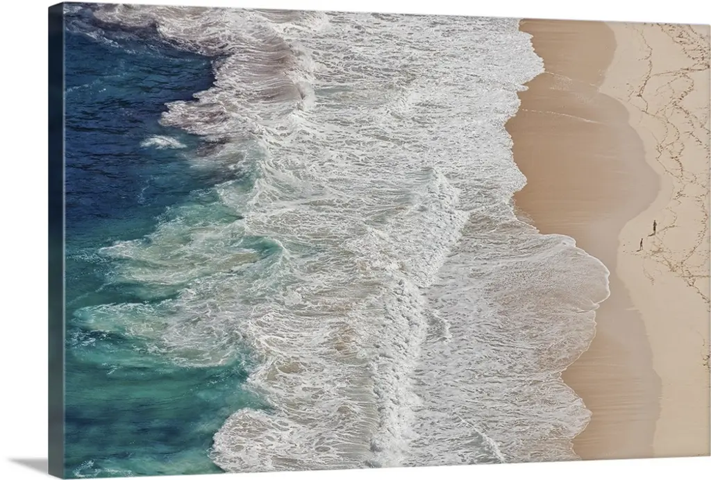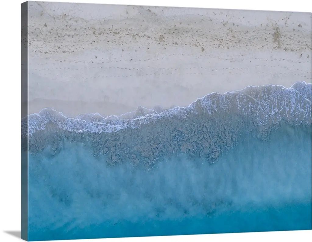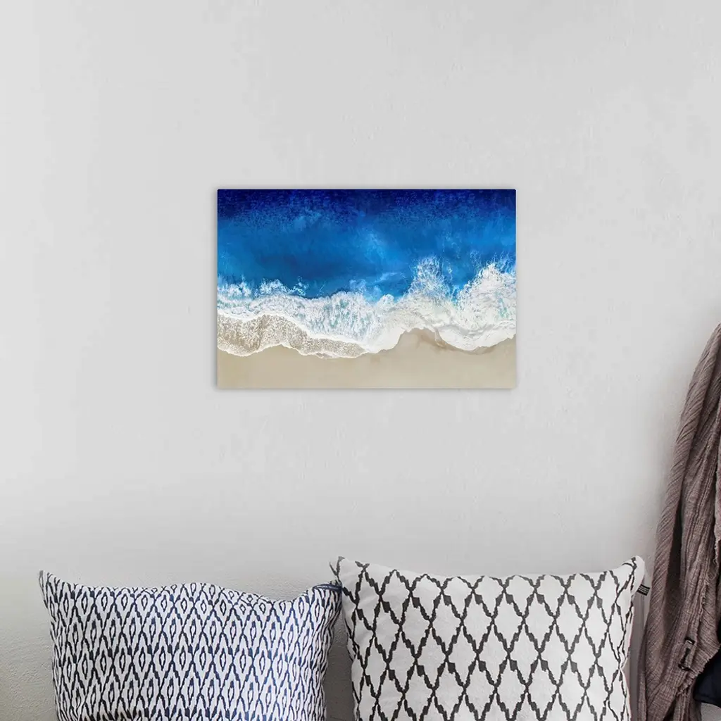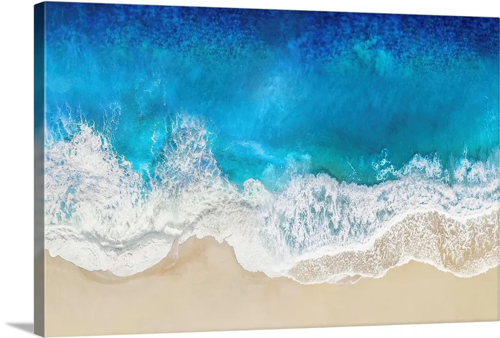 One artwork in a series of aerial shots of a beach as dark blue waves break upon the shore.