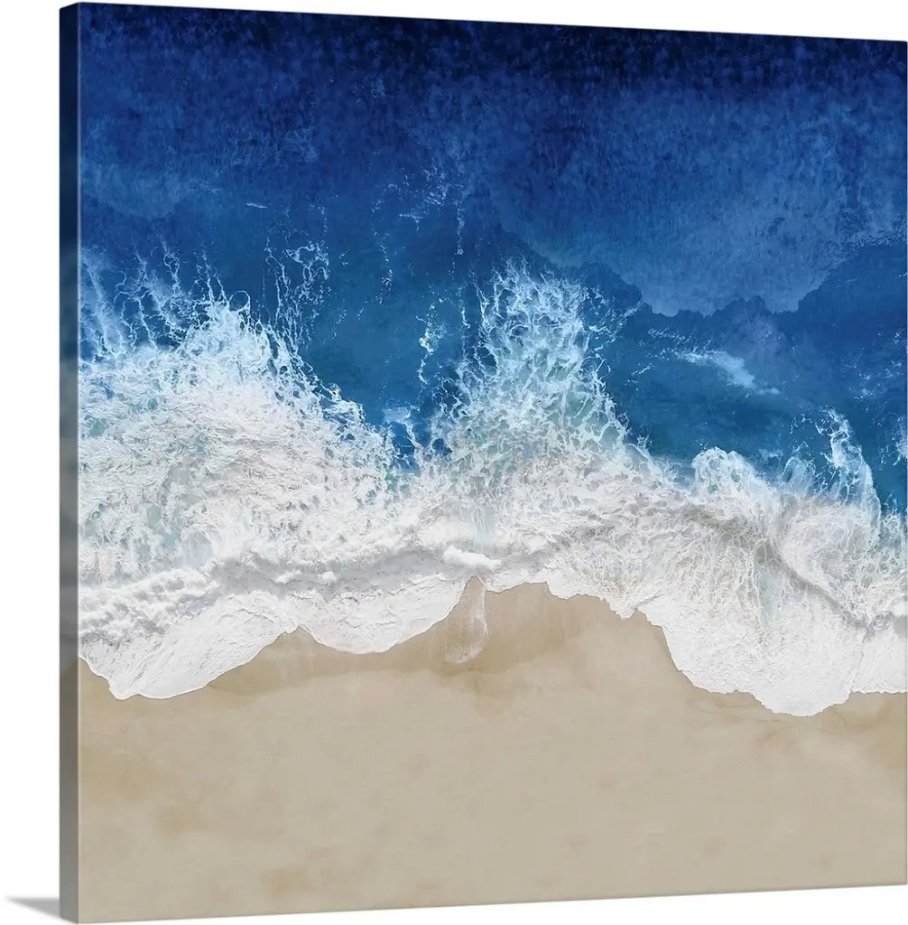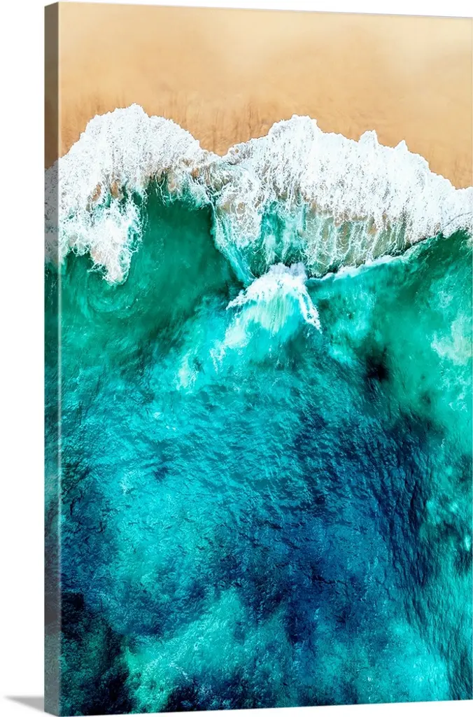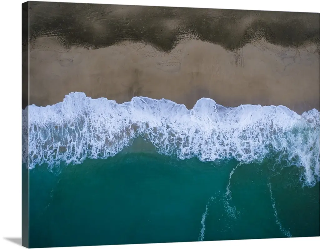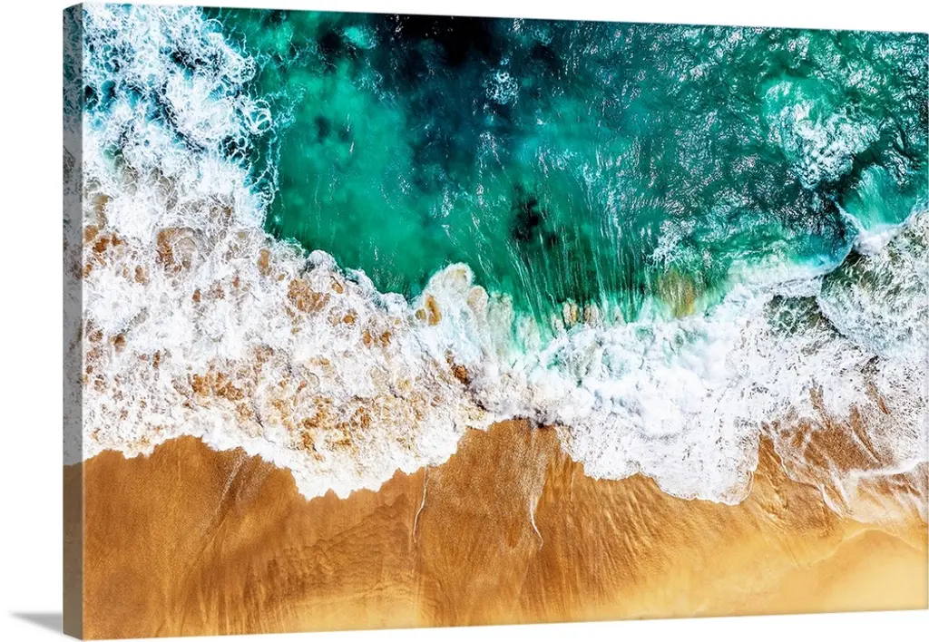 One artwork in a series of aerial shots of a beach as dark blue waves break upon the shore.