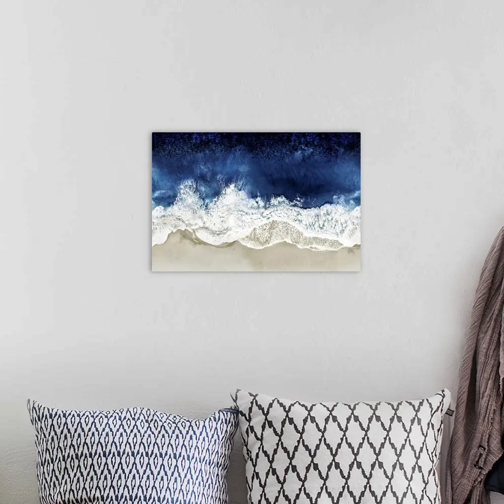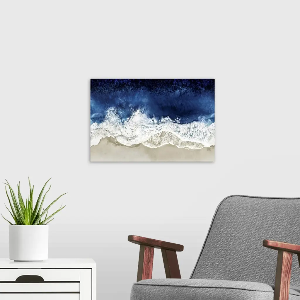One artwork in a series of aerial shots of a beach as dark blue waves break upon the shore.
