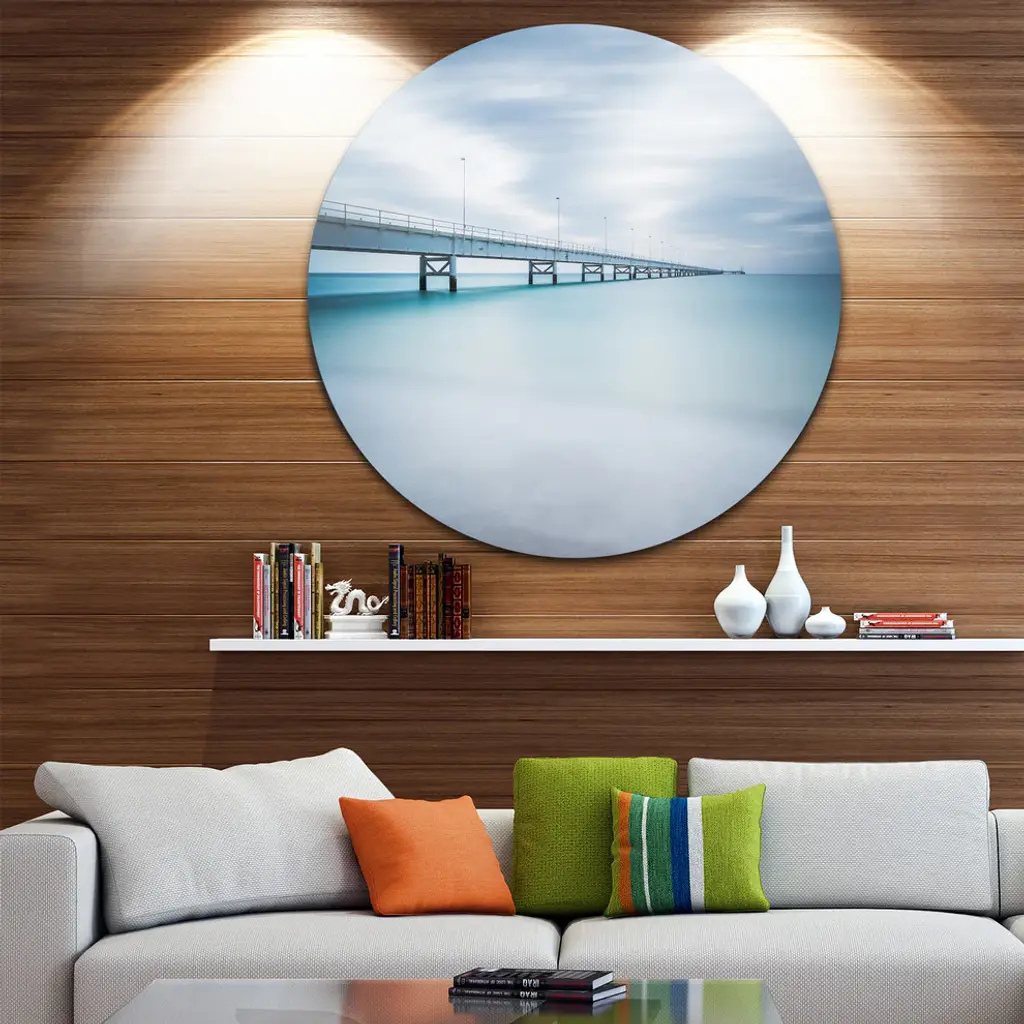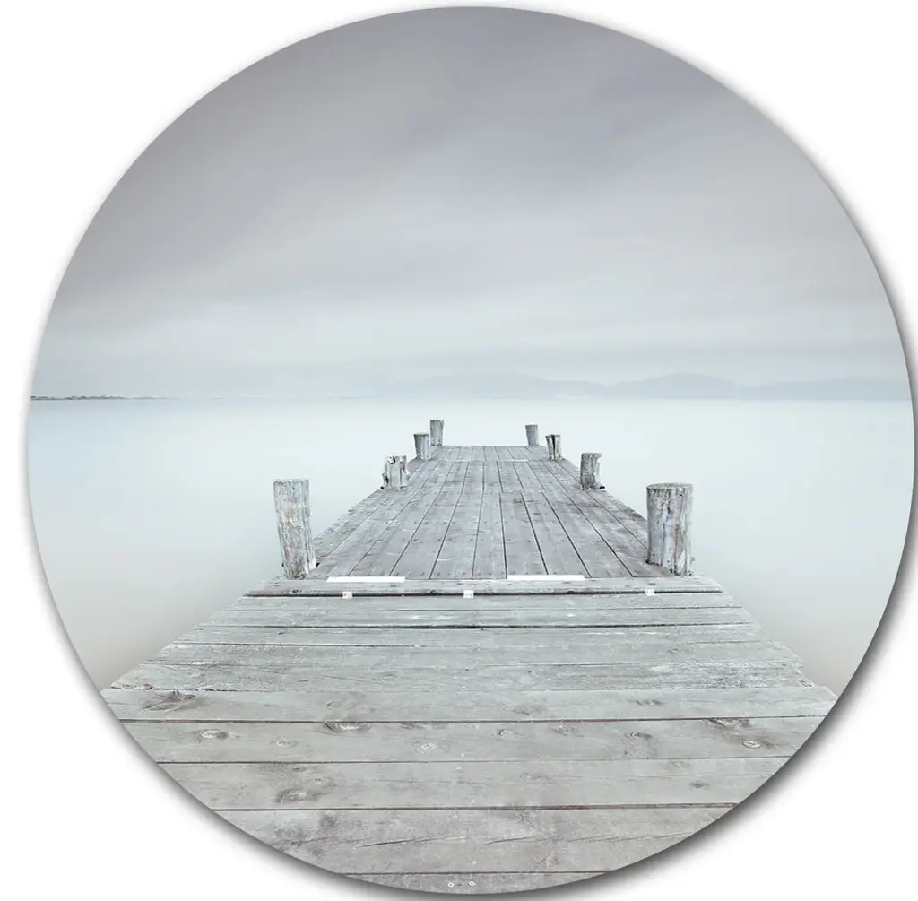 Bring Contemporary Abstraction to your home with this large Circle Metal wall art. This Industrial Pier Side view Metal Artwork makes it the focal point of any room or office. - White Gloss Coating ensures colors are extra vibrant with light reflection.- Aluminum grade Sheet Metal with 1 inch mounting frame on the back giving the illusion that the artwork is floating on the wall..- Mounting Brackets are included along with instructions.- High Quality Digital images are created directly into a glossy aluminum panel producing a stunning and captivating print into the glossy finish of the metal.- Water, Fire and Scratch resistant HD Aluminum panels.- Looks better than any photo paper and guaranteed to last at least 20 years- Easy to clean with a microfiber cloth. Colors are far superior to regular Canvas Art. - Easy to Hang