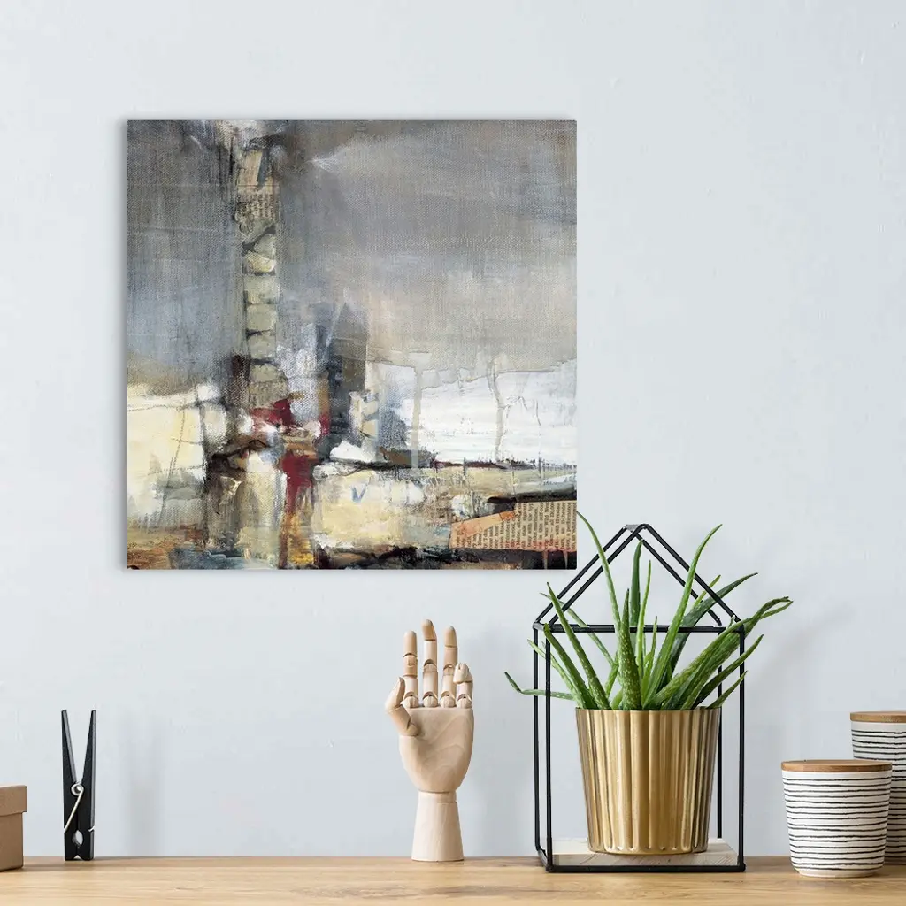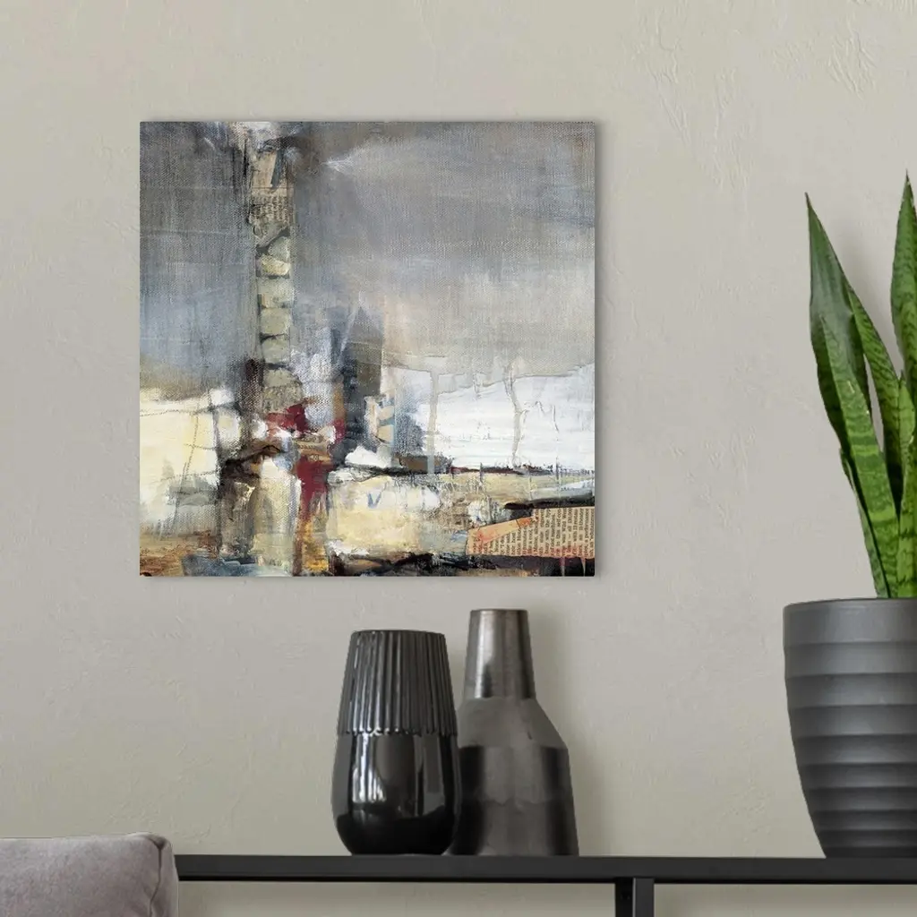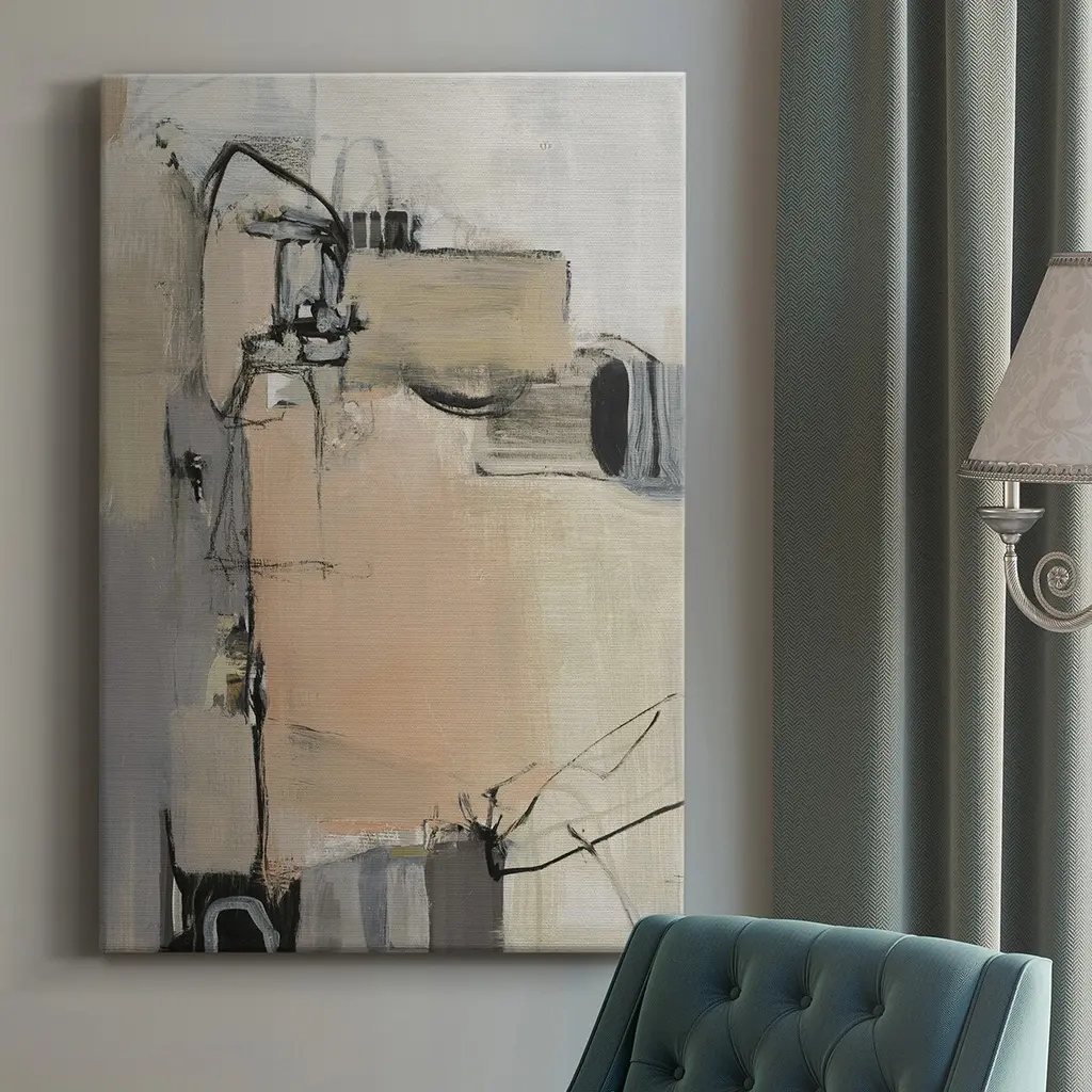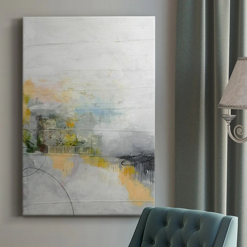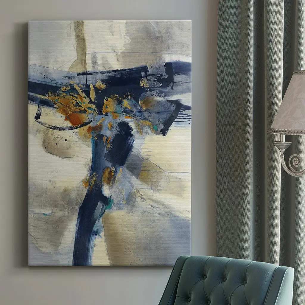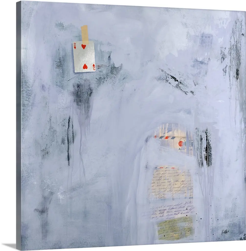 Contemporary abstract painting using cool colors with hints of warm tones in a color field of icy blue.