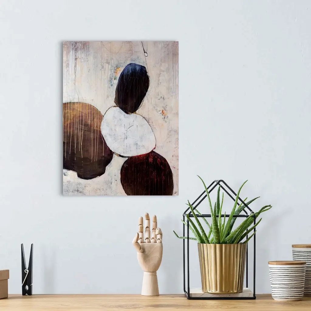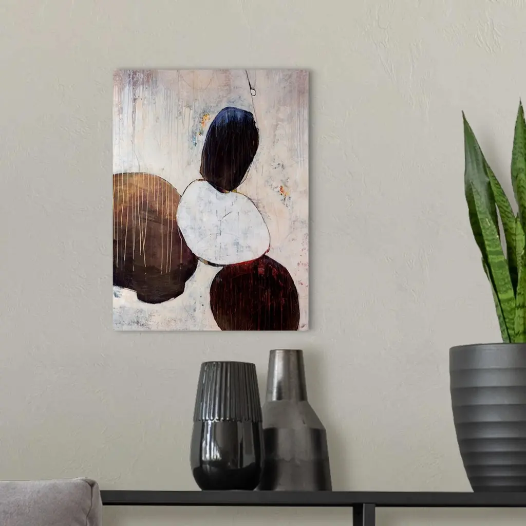 Abstract artwork that consists of four large rounded objects that has paint from the top of the print dripping down over them.